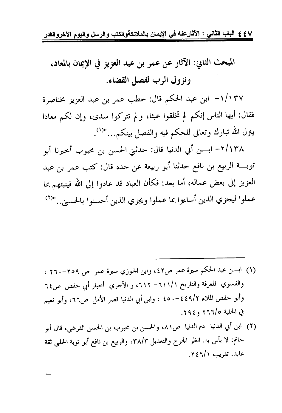 المبحث الثاني: الآثار عن عمر بن عبد العزيز في الإيمان بالمعاد، ونزول الرب لفصل القضاء.