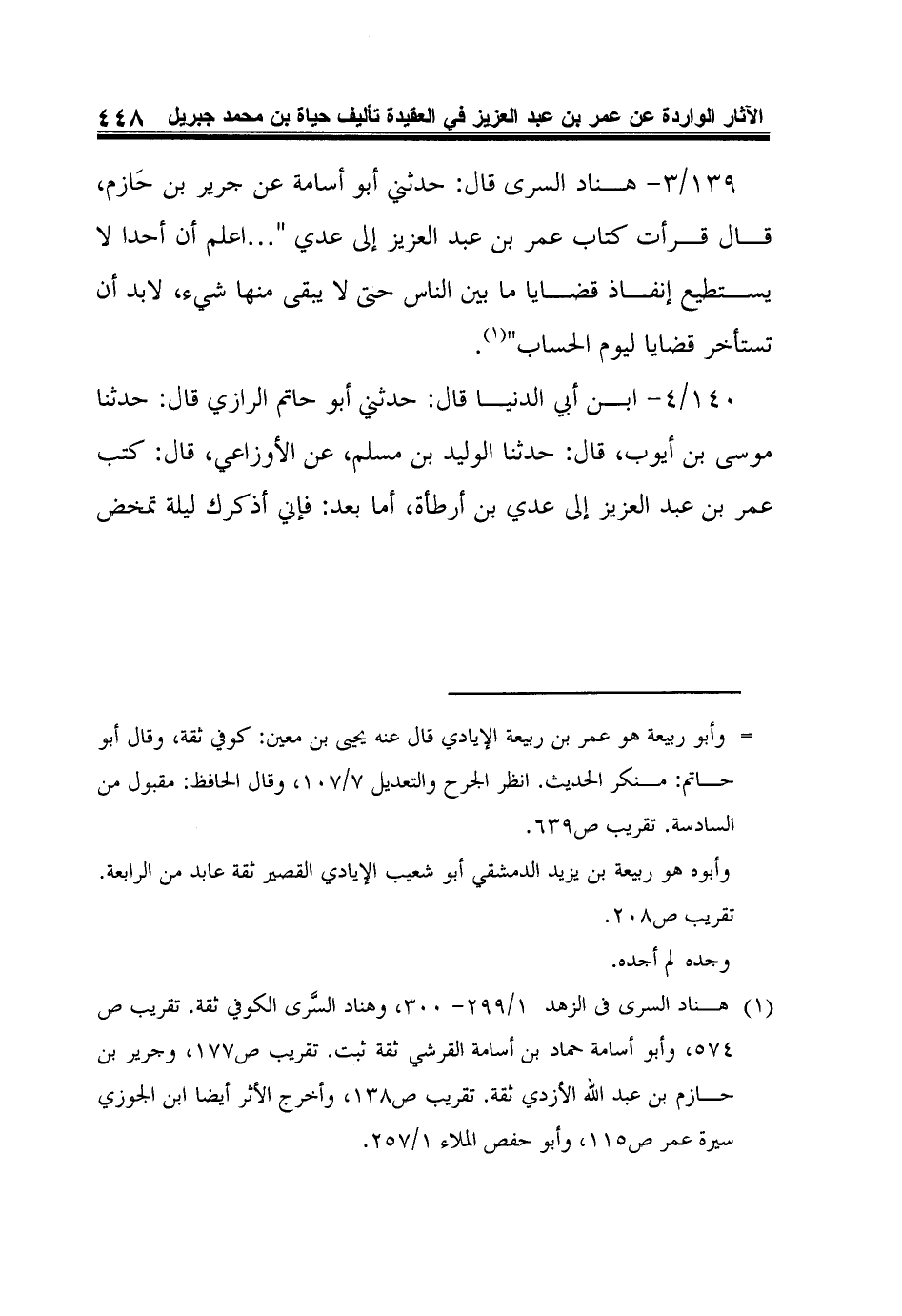 139/3- هناد السرى قال: حدثني أبو أسامة عن جرير بن حَازم، قال قرأت كتاب عمر بن عبد العزيز إلى عدي " ... اعلم أن أحدا لا يستطيع إنفاذ قضايا ما بين الناس حتى لا يبقى منها شيء، لابد أن تستأخر قضايا ليوم الحساب"1.