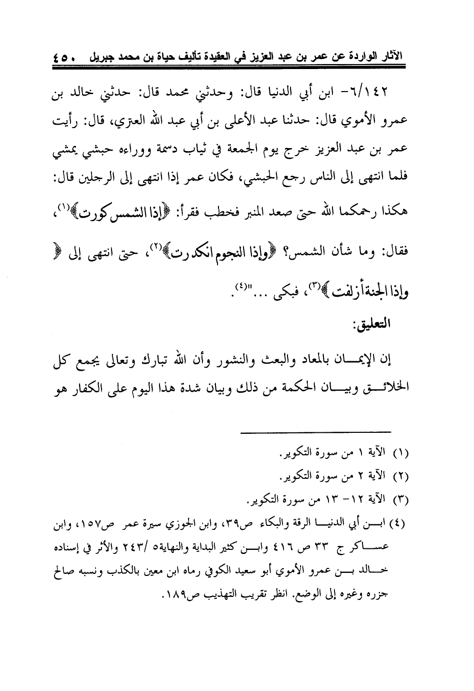 142/6- ابن أبي الدنيا قال: وحدثني محمد قال: حدثني خالد بن عمرو الأموي قال: حدثنا عبد الأعلى بن أبي عبد الله العنزي، قال: رأيت عمر بن عبد العزيز خرج يوم الجمعة في ثياب دسمة ووراءه حبشي يمشي فلما انتهى إلى الناس رجع الحبشي، فكان عمر إذا انتهى إلى الرجلين قال: هكذا رحمكما الله حتى صعد المنبر فخطب فقرأ: {إِذَا الشَّمْسُ كُوِّرَتْ} 1، فقال: وما شأن الشمس؟ {وَإِذَا النُّجُومُ انْكَدَرَت} 2، حتى انتهى إلى {وَإِذَا الْجَنَّةُ أُزْلِفَت} 3، فبكى ... "4.