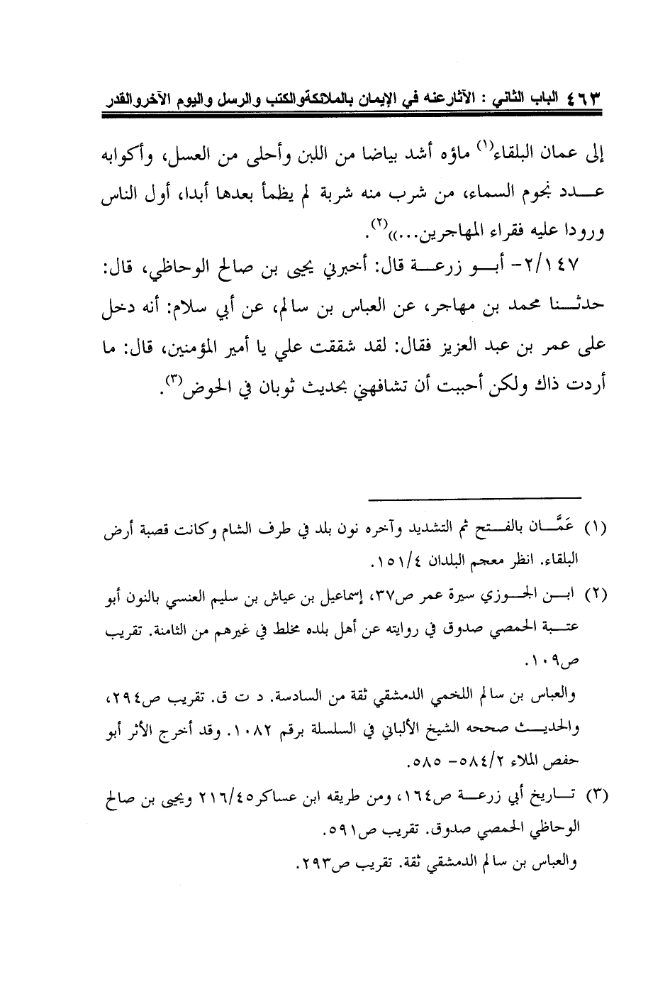 147/2- أبو زرعة قال: أخبرني يحيى بن صالح الوحاظي، قال: حدثنا محمد بن مهاجر، عن العباس بن سالم، عن أبي سلام: أنه دخل على عمر بن عبد العزيز فقال: لقد شققت علي يا أمير المؤمنين، قال: ما أردت ذاك ولكن أحببت أن تشافهني بحديث ثوبان في الحوض3.