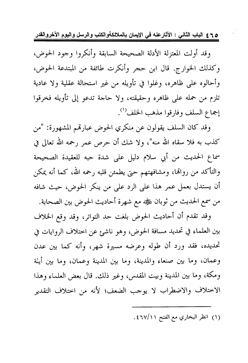 وقد تقدم أن أحاديث الحوض بلغت حد التواتر، وقد وقع الخلاف بين العلماء في تحديد مسافة الحوض، وهو ناشئ عن اختلاف الروايات في تحديده، فقد ورد أن طوله وعرضه مسيرة شهر، وأنه كما بين عدن وعمان، وما بين صنعاء والمدينة، وما بين المدينة وعمان، وما بين أيلة ومكة، وما بين المدينة وبيت المقدس، وغير ذلك. قال بعض العلماء وهذا الاختلاف والاضطراب لا يوجب الضعف، لأنه من اختلاف التقدير