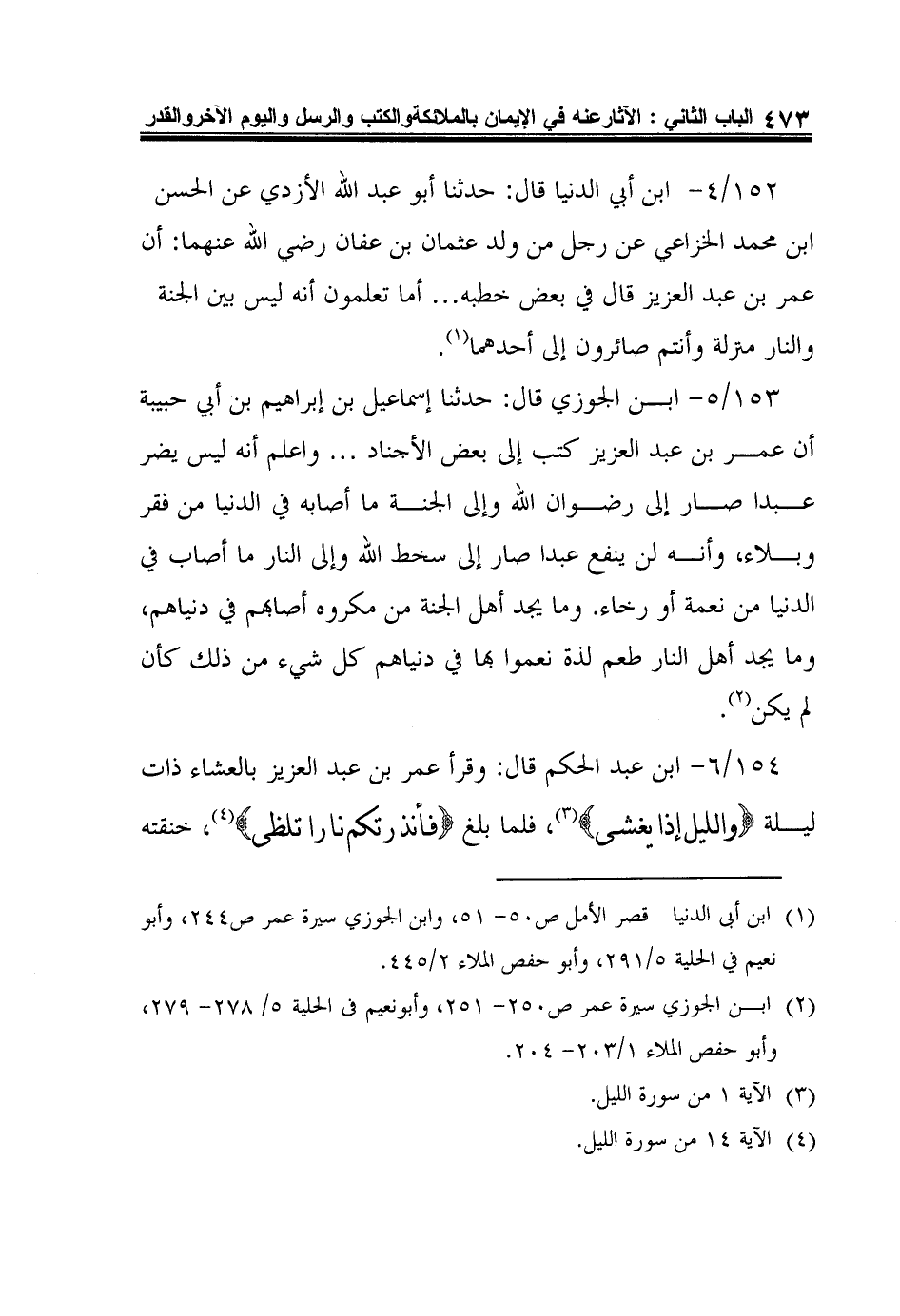 152/4- ابن أبي الدنيا قال: حدثنا أبو عبد الله الأزدي عن الحسن ابن محمد الخزاعي عن رجل من ولد عثمان بن عفان رضي الله عنهما: أن عمر بن عبد العزيز قال في بعض خطبه ... أما تعلمون أنه ليس بين الجنة والنار منزلة وأنتم صائرون إلى أحدهما1.