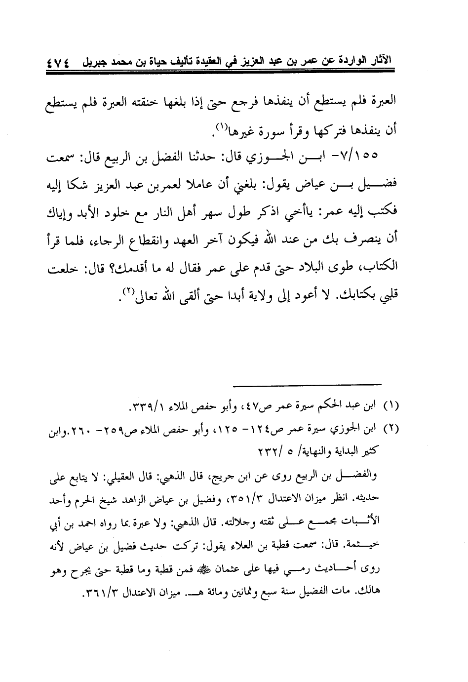 155/7- ابن الجوزي قال: حدثنا الفضل بن الربيع قال: سمعت فضيل بن عياض يقول: بلغني أن عاملا لعمربن عبد العزيز شكا إليه فكتب إليه عمر: ياأخي اذكر طول سهر أهل النار مع خلود الأبد وإياك أن ينصرف بك من عند الله فيكون آخر العهد وانقطاع الرجاء، فلما قرأ الكتاب، طوى البلاد حتى قدم على عمر فقال له ما أقدمك؟ قال: خلعت قلبي بكتابك. لا أعود إلى ولاية أبدا حتى ألقى الله تعالى2.