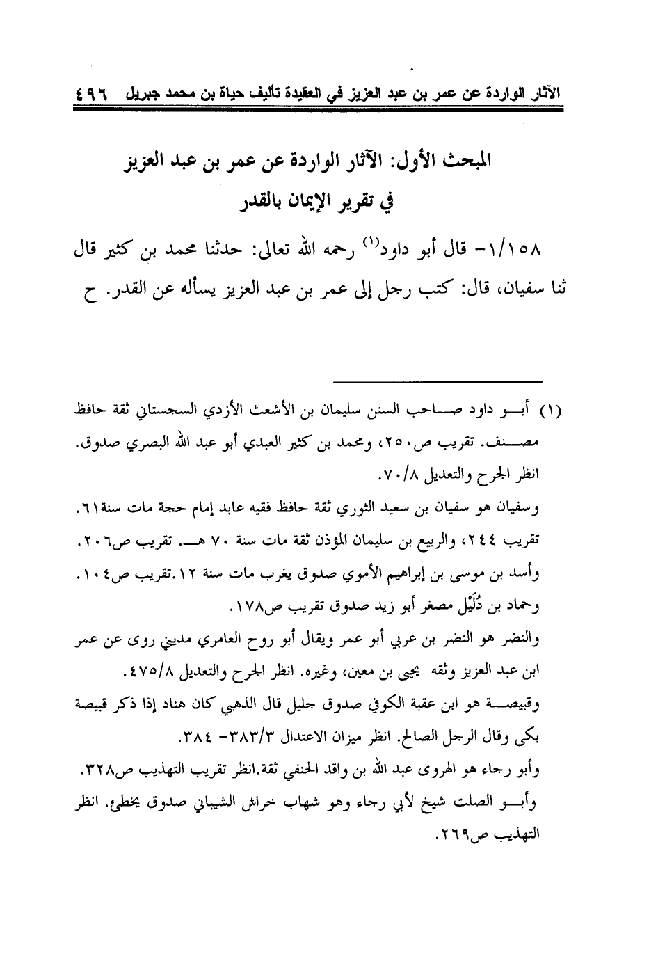 158/1- قال أبو داود1 رحمه الله تعالى: حدثنا محمد بن كثير قال ثنا سفيان، قال: كتب رجل إلى عمر بن عبد العزيز يسأله عن القدر. ح.