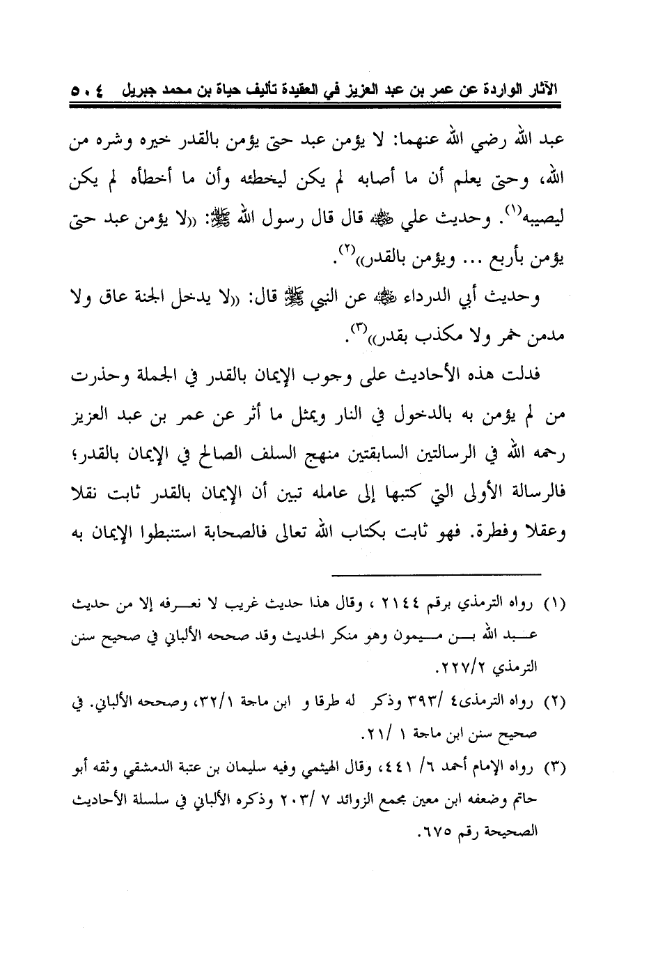 عبد الله رضي الله عنهما: "لا يؤمن عبد حتى يؤمن بالقدر خيره وشره من الله، وحتى يعلم أن ما أصابه لم يكن ليخطئه وأن ما أخطأه لم يكن ليصيبه"1. وحديث علي رضي الله عنه قال قال رسول الله صلى الله عليه وسلم: "لا يؤمن عبد حتى يؤمن بأربع ... ويؤمن بالقدر"2.