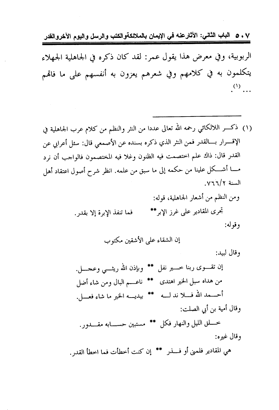 1 ذكر اللالكائي رحمه الله تعالى عددا من النثر والنظم من كلام عرب الجاهلية في الإقرار بالقدر فمن النثر الذي ذكره بسنده عن الأصمعي قال: سئل أعرابي عن القدر قال: ذاك علم اختصمت فيه الظنون وغلا فيه المختصمون فالواجب أن نرد ما أشكل علينا من حكمه إلى ما سبق من علمه. انظر شرح أصول اعتقاد أهل السنة 2/766.