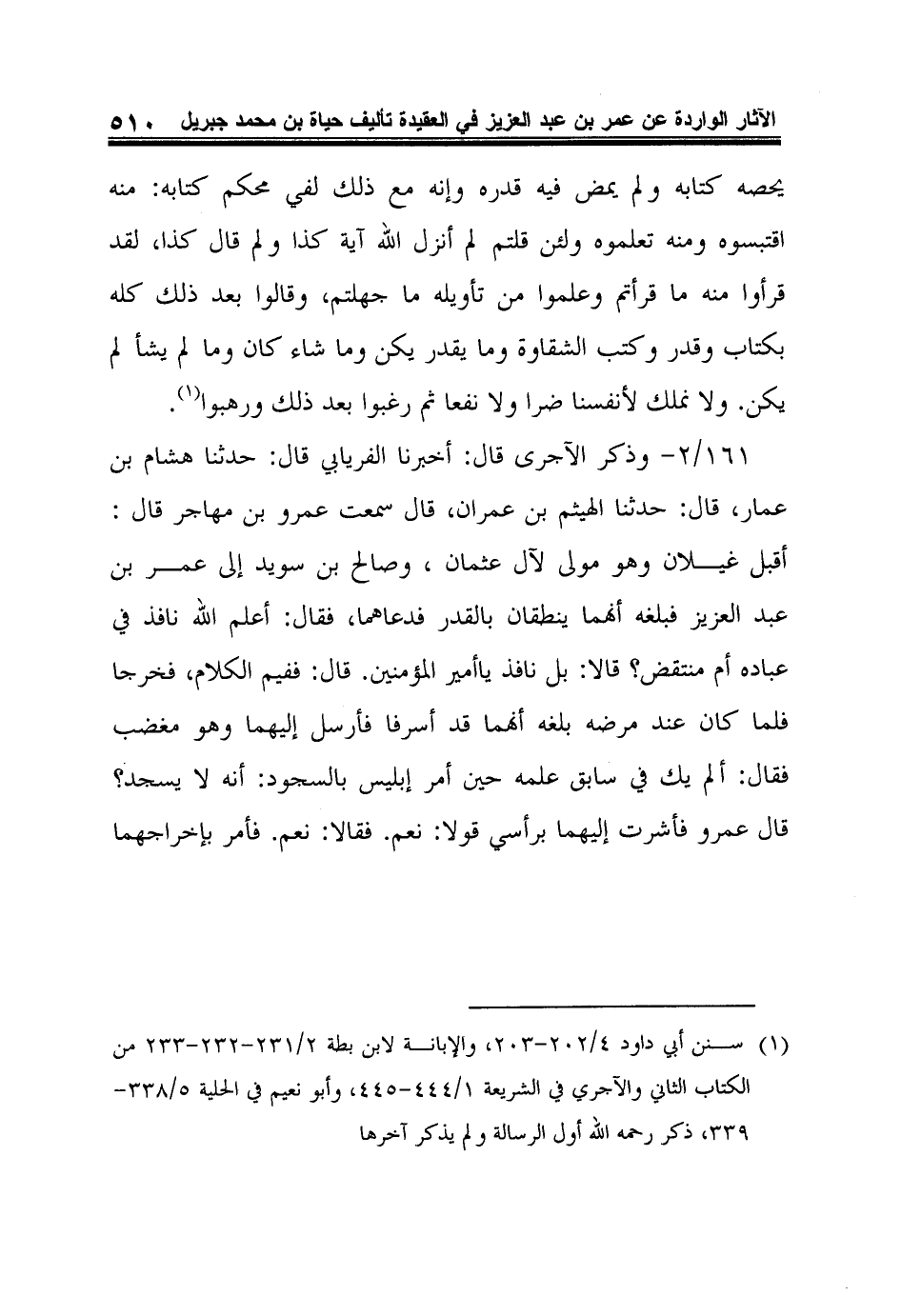 161/2- وذكر الآجرى قال: أخبرنا الفريابي قال: حدثنا هشام بن عمار، قال: حدثنا الهيثم بن عمران، قال سمعت عمرو بن مهاجر قال: أقبل غيلان وهو مولى لآل عثمان، وصالح بن سويد إلى عمر بن عبد العزيز فبلغه أنهما ينطقان بالقدر فدعاهما، فقال: أعلم الله نافذ في عباده أم منتقض؟ قالا: بل نافذ ياأمير المؤمنين. قال: ففيم الكلام، فخرجا فلما كان عند مرضه بلغه أنهما قد أسرفا فأرسل إليهما وهو مغضب فقال: ألم يك في سابق علمه حين أمر إبليس بالسجود: أنه لا يسجد؟ قال عمرو فأشرت إليهما برأسي قولا: نعم. فقالا: نعم. فأمر بإخراجهما