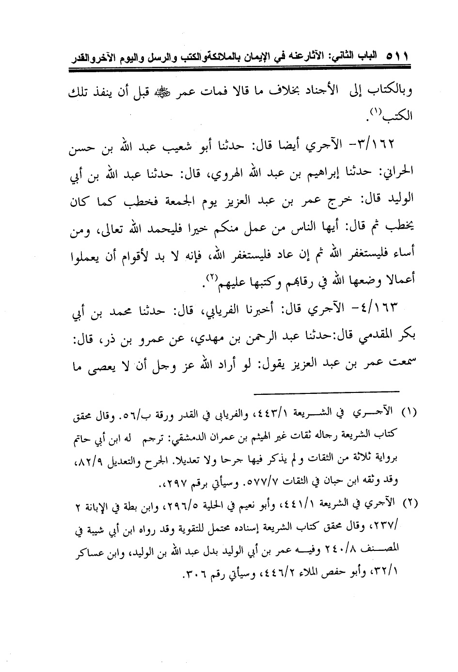 1 الآجري في الشريعة 1/443، والفريابى في القدر ورقة ب/56. وقال محقق كتاب الشريعة رجاله ثقات غير الهيثم بن عمران الدمشقي: ترجم له ابن أبي حاتم برواية ثلاثة من الثقات ولم يذكر فيها جرحا ولا تعديلا. الجرح والتعديل 9/82، وقد وثقه ابن حبان في الثقات 7/577. وسيأتي برقم 297.