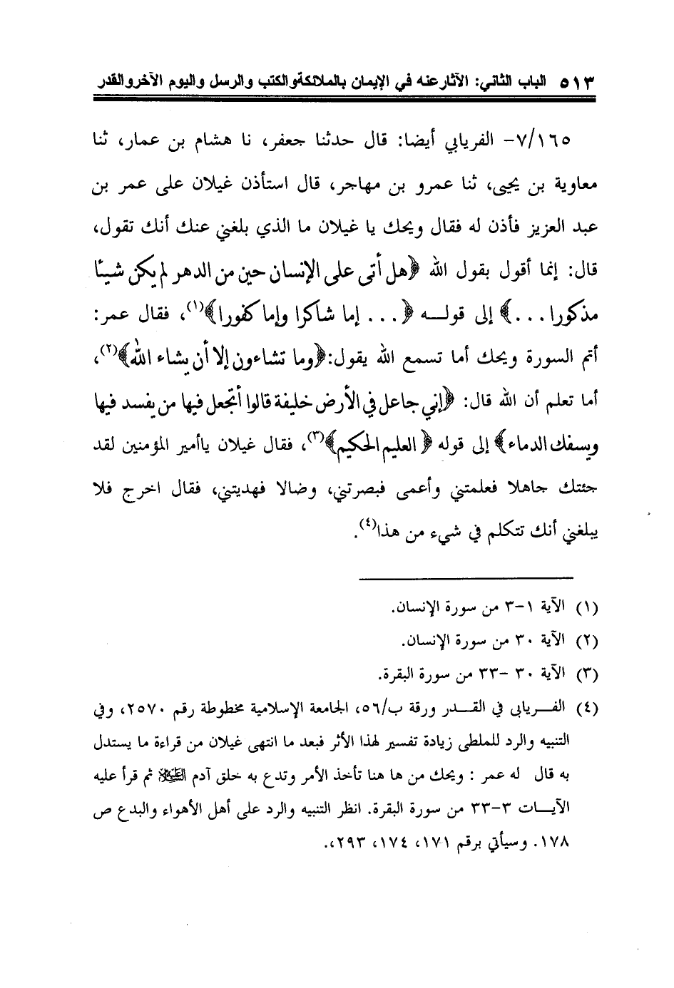 4 الفريابى في القدر ورقة ب/56، الجامعة الإسلامية مخطوطة رقم 2570، وفي التنبيه والرد للملطى زيادة تفسير لهذا الأثر فبعد ما انتهى غيلان من قراءة ما يستدل به قال له عمر: ويحك من ها هنا تأخذ الأمر وتدع به خلق آدم عليه السلام ثم قرأ عليه الآيات 3-33 من سورة البقرة. انظر التنبيه والرد على أهل الأهواء والبدع ص178. وسيأتي برقم 171، 174، 293،.