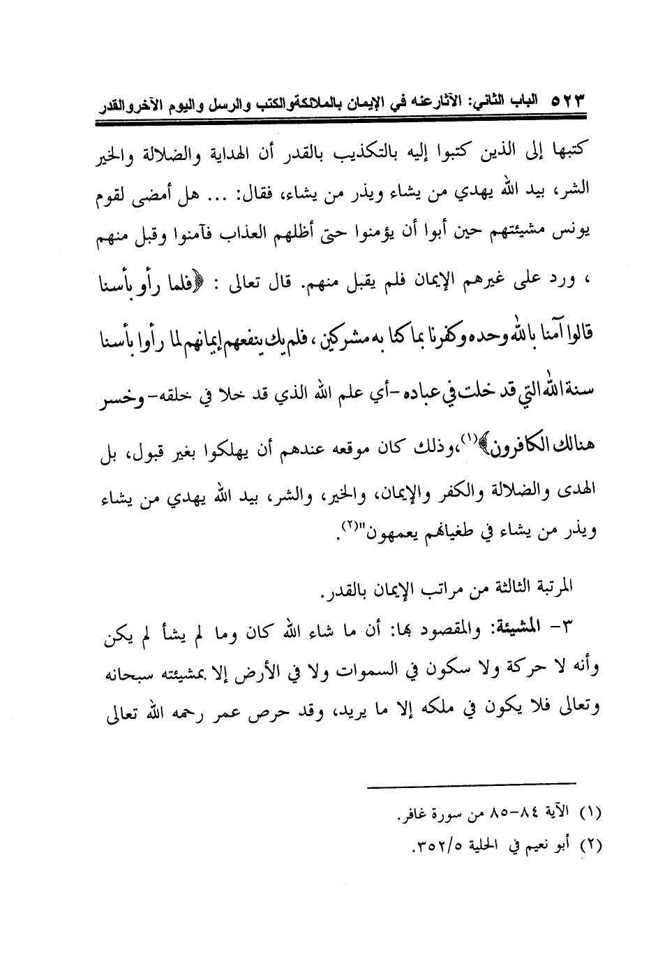 3- المشيئة: والمقصود بها: أن ما شاء الله كان وما لم يشأ لم يكن وأنه لا حركة ولا سكون في السموات ولا في الأرض إلا بمشيئته سبحانه وتعالى فلا يكون في ملكه إلا ما يريد، وقد حرص عمر رحمه الله تعالى