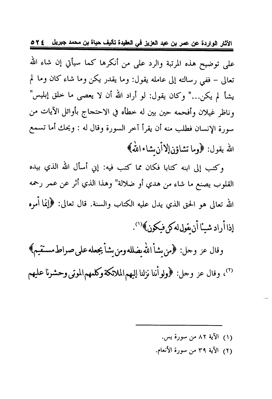 وكتب إلى ابنه كتابا فكان مما كتب فيه: إني أسأل الله الذي بيده القلوب يصنع ما شاء من هدي أو ضلالة" وهذا الذي أثر عن عمر رحمه الله تعالى هو الحق الذي يدل عليه الكتاب والسنة. قال تعالى: {إِنَّمَا أَمْرُهُ إِذَا أَرَادَ شَيْئاً أَنْ يَقُولَ لَهُ كُنْ فَيَكُونُ} 1.