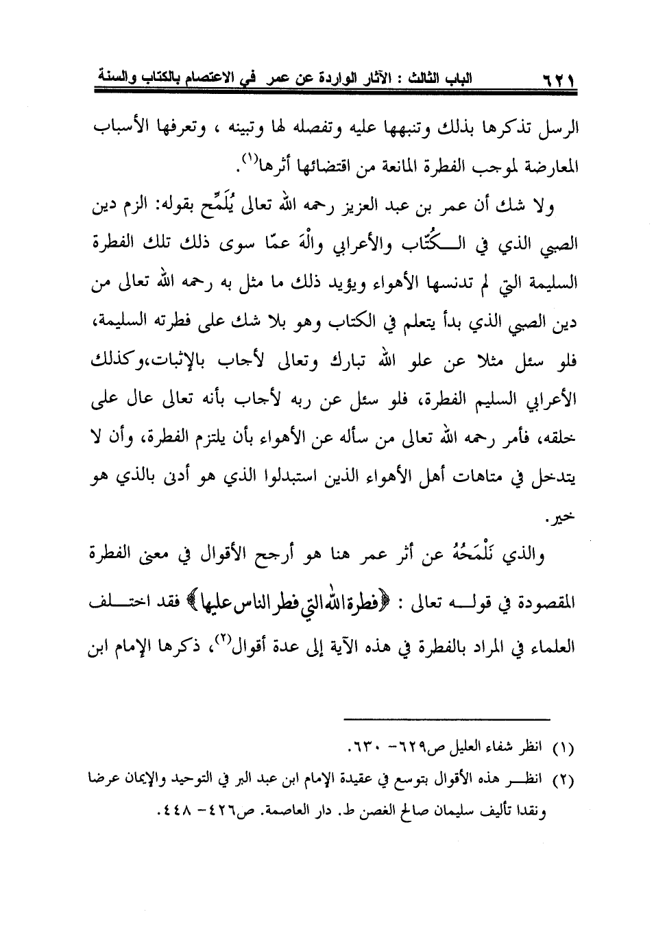 ولا شك أن عمر بن عبد العزيز رحمه الله تعالى يُلَمِّح بقوله: الزم دين الصبي الذي في الكُتّاب والأعرابي والْهَ عمّا سوى ذلك تلك الفطرة السليمة التي لم تدنسها الأهواء ويؤيد ذلك ما مثل به رحمه الله تعالى من دين الصبي الذي بدأ يتعلم في الكتاب وهو بلا شك على فطرته السليمة, فلو سئل مثلا عن علو الله تبارك وتعالى لأجاب بالإثبات, وكذلك الأعرابي السليم الفطرة, فلو سئل عن ربه لأجاب بأنه تعالى عال على خلقه, فأمر رحمه الله تعالى من سأله عن الأهواء بأن يلتزم الفطرة، وأن لا يتدخل في متاهات أهل الأهواء الذين استبدلوا الذي هو أدنى بالذي هو خير.