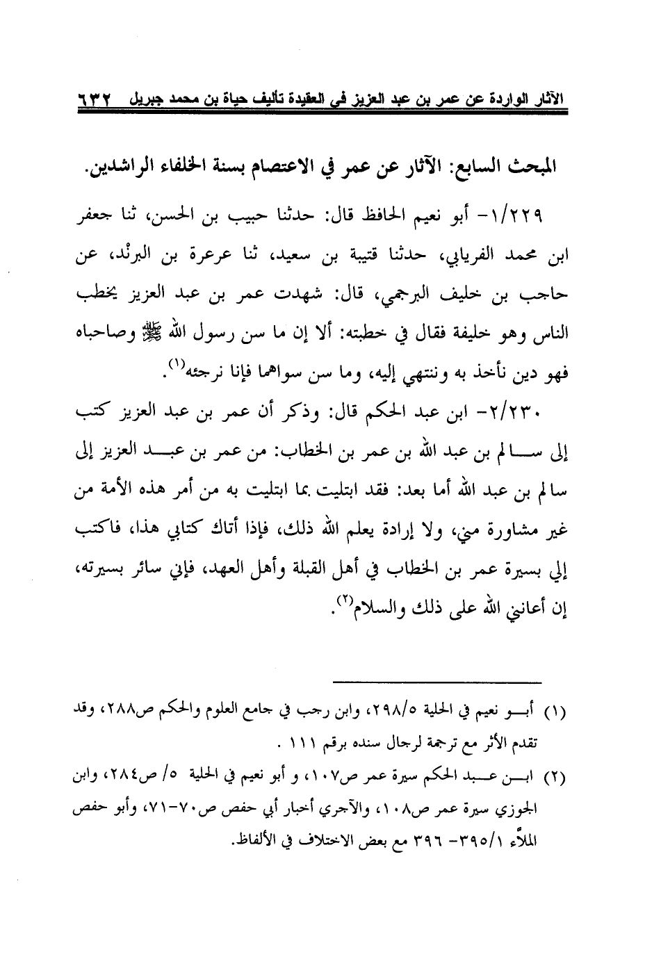 229/1- أبو نعيم الحافظ قال: حدثنا حبيب بن الحسن، ثنا جعفر ابن محمد الفريابي، حدثنا قتيبة بن سعيد، ثنا عرعرة بن البرنْد، عن حاجب بن خليف البرجمي، قال: شهدت عمر بن عبد العزيز يخطب الناس وهو خليفة فقال في خطبته: ألا إن ما سن رسول الله صلى الله عليه وسلم وصاحباه فهو دين نأخذ به وننتهي إليه، وما سن سواهما فإنا نرجئه1.