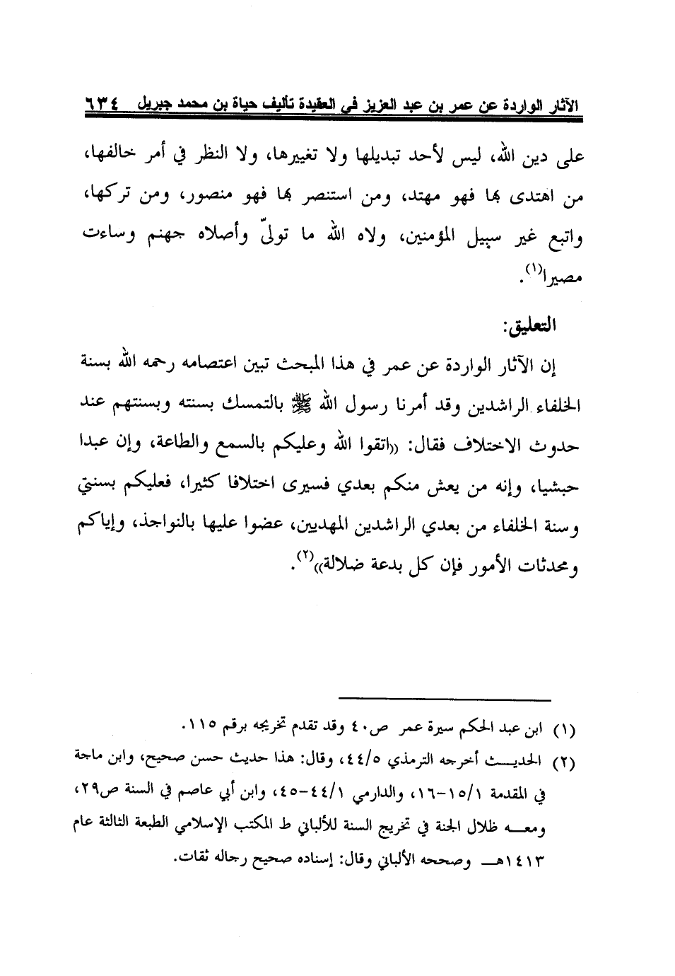 إن الآثار الواردة عن عمر في هذا المبحث تبين اعتصامه رحمه الله بسنة الخلفاء الراشدين وقد أمرنا رسول الله صلى الله عليه وسلم بالتمسك بسنته وبسنتهم عند حدوث الاختلاف فقال: "اتقوا الله وعليكم بالسمع والطاعة، وإن عبدا حبشيا، وإنه من يعش منكم بعدي فسيرى اختلافا كثيرا، فعليكم بسنتي وسنة الخلفاء من بعدي الراشدين المهديين، عضوا عليها بالنواجذ، وإياكم ومحدثات الأمور فإن كل بدعة ضلالة" 2.