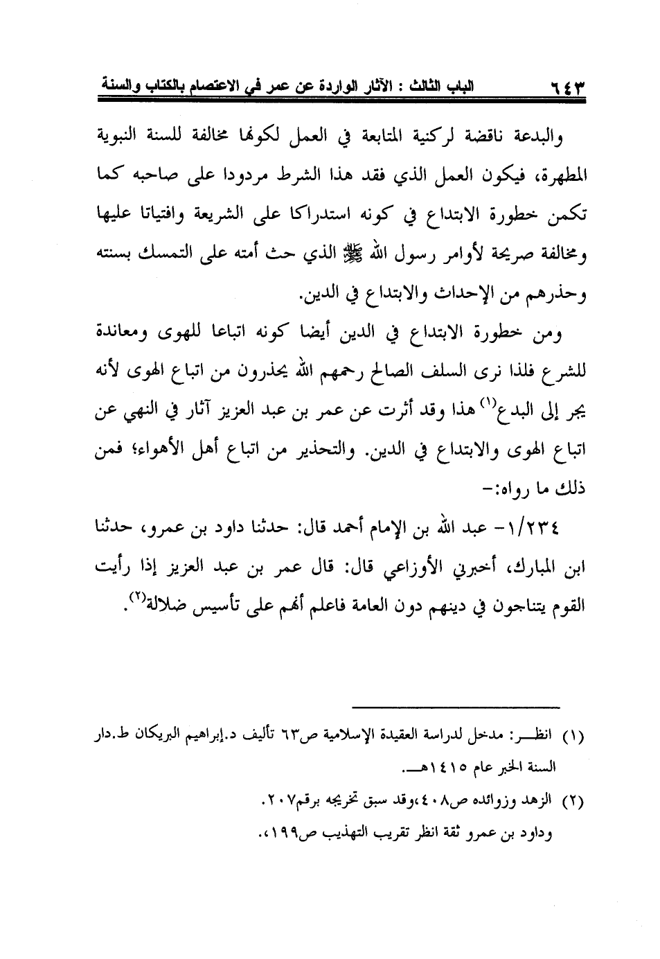 234/1- عبد الله بن الإمام أحمد قال: حدثنا داود بن عمرو، حدثنا ابن المبارك، أخبرني الأوزاعي قال: قال عمر بن عبد العزيز: إذا رأيت القوم يتناجون في دينهم دون العامة فاعلم أنهم على تأسيس ضلالة2.