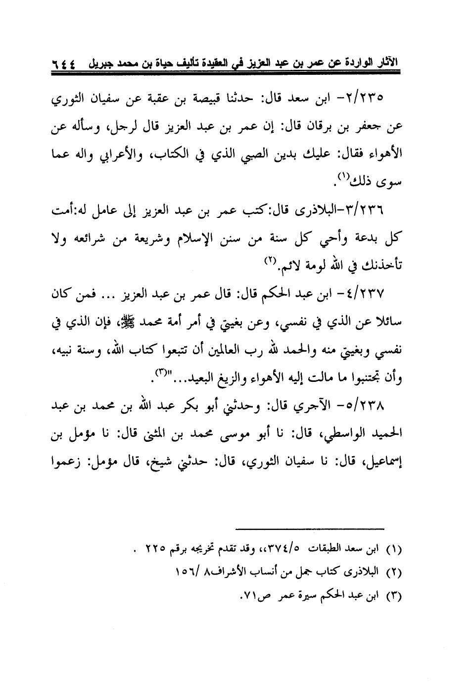 235/2- ابن سعد قال: حدثنا قبيصة بن عقبة عن سفيان الثوري عن جعفر بن برقان قال: إن عمر بن عبد العزيز قال لرجل، وسأله عن الأهواء فقال: عليك بدين الصبي الذي في الكتاب، والأعرابي واله عما سوى ذلك1.
