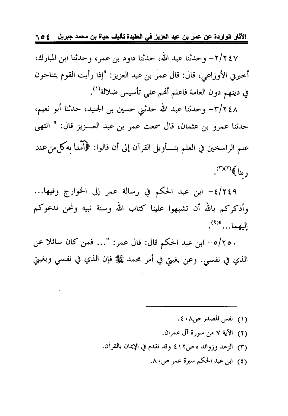 249/4- ابن عبد الحكم في رسالة عمر إلى الخوارج وفيها ... وأذكركم بالله أن تشبهوا علينا كتاب الله وسنة نبيه ونحن ندعوكم إليهما ... "4.