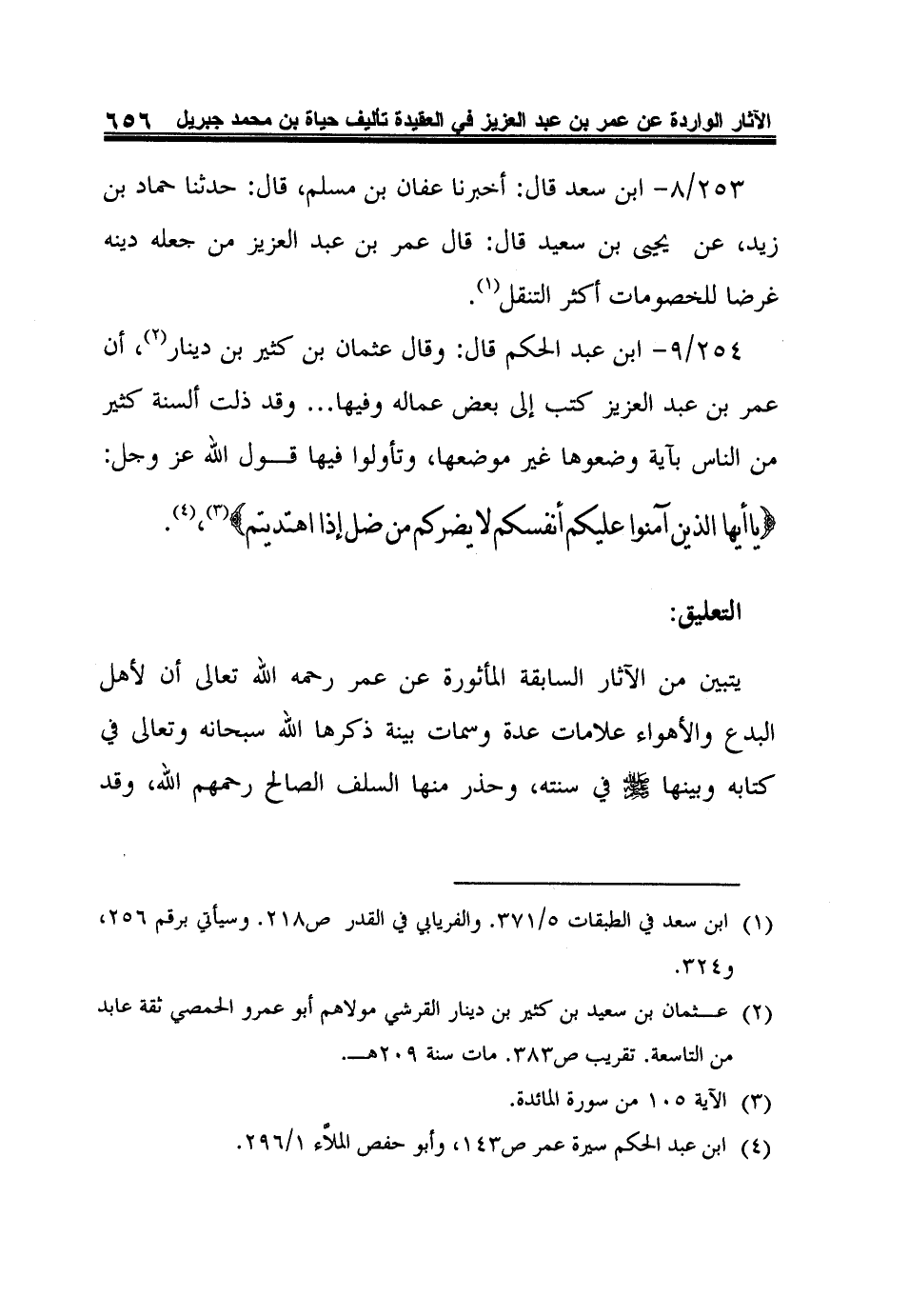 254/9- ابن عبد الحكم قال: وقال عثمان بن كثير بن دينار2، أن عمر بن عبد العزيز كتب إلى بعض عماله وفيها ... وقد ذلت ألسنة كثير من الناس بآية وضعوها غير موضعها، وتأولوا فيها قول الله عز وجل: {يَا أَيُّهَا الَّذِينَ آمَنُوا عَلَيْكُمْ أَنْفُسَكُمْ لا يَضُرُّكُمْ مَنْ ضَلَّ إِذَا اهْتَدَيْتُمْ} 3،4.