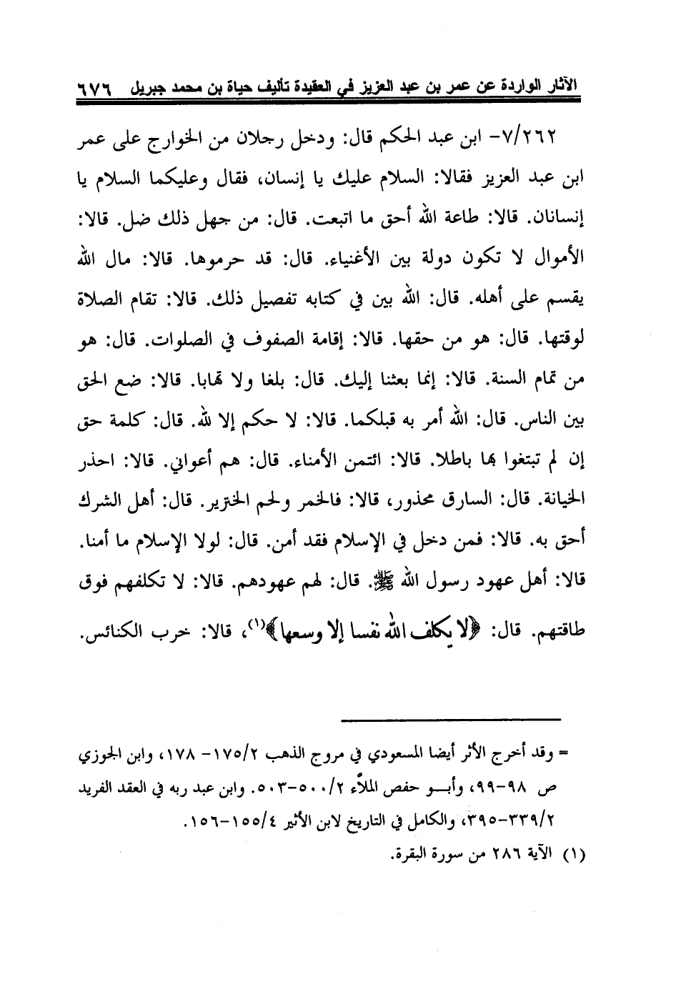 262/7- ابن عبد الحكم قال: ودخل رجلان من الخوارج على عمر ابن عبد العزيز فقالا: السلام عليك يا إنسان، فقال وعليكما السلام يا إنسانان. قالا: طاعة الله أحق ما اتبعت. قال: من جهل ذلك ضل. قالا: الأموال لا تكون دولة بين الأغنياء. قال: قد حرموها. قالا: مال الله يقسم على أهله. قال: الله بين في كتابه تفصيل ذلك. قالا: تقام الصلاة لوقتها. قال: هو من حقها. قالا: إقامة الصفوف في الصلوات. قال: هو من تمام السنة. قالا: إنما بعثنا إليك. قال: بلغا ولا تهابا. قالا: ضع الحق بين الناس. قال: الله أمر به قبلكما. قالا: لا حكم إلا لله. قال: كلمة حق إن لم تبتغوا بها باطلا. قالا: ائتمن الأمناء. قال: هم أعواني. قالا: احذر الخيانة. قال: السارق محذور، قالا: فالخمر ولحم الخنزير. قال: أهل الشرك أحق به. قالا: فمن دخل في الإسلام فقد أمن. قال: لولا الإسلام ما أمنا. قالا: أهل عهود رسول الله صلى الله عليه وسلم. قال: لهم عهودهم. قالا: لا تكلفهم فوق طاقتهم. قال: {لا يُكَلِّفُ اللَّهُ نَفْساً إِلاَّ وُسْعَهَا} 1، قالا: خرب الكنائس.