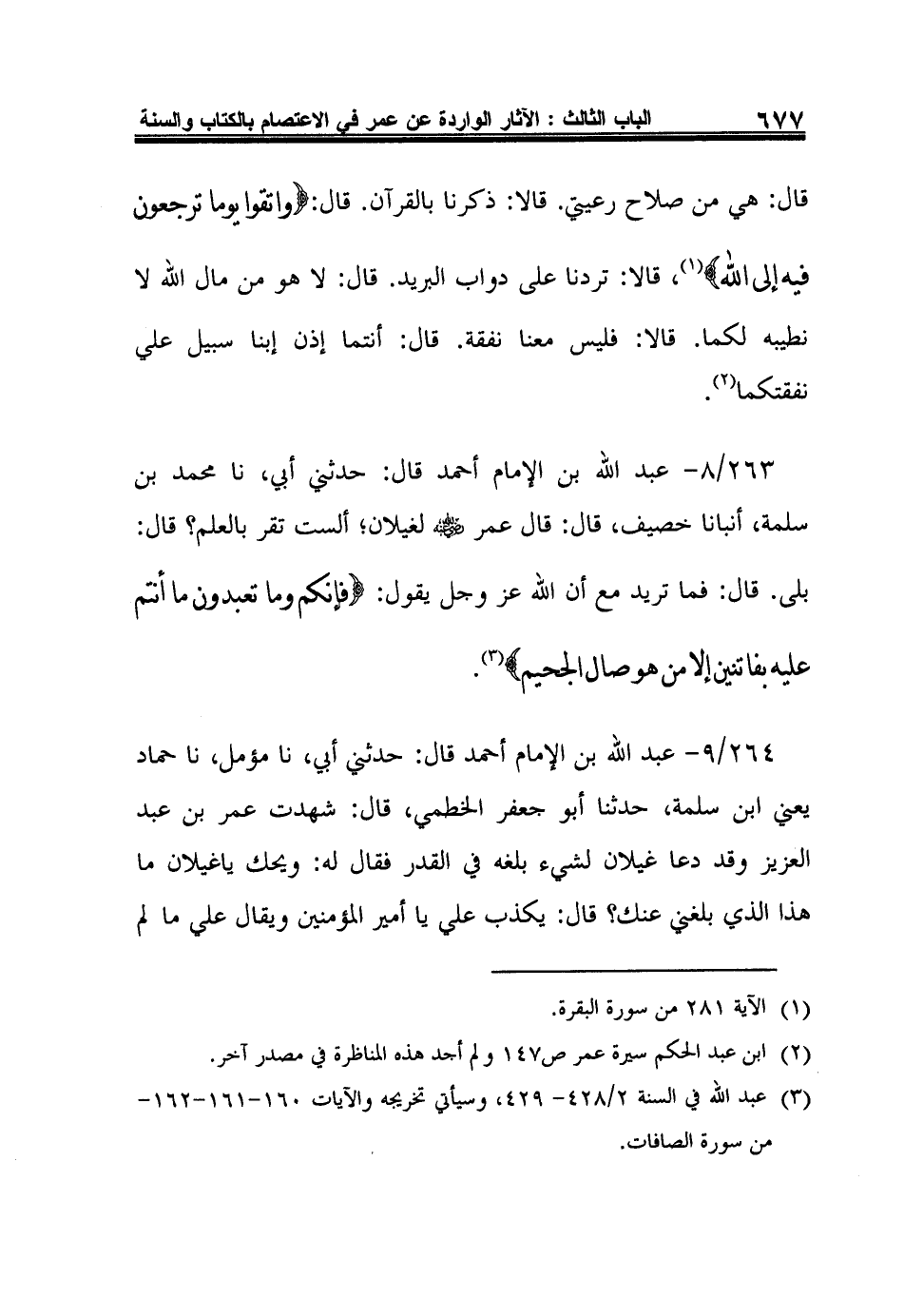 263/8- عبد الله بن الإمام أحمد قال: حدثني أبي، نا محمد بن سلمة، أنبانا خصيف، قال: قال عمر رضي الله عنه لغيلان: ألست تقر بالعلم؟ قال: بلى. قال: فما تريد مع أن الله عز وجل يقول: {فَإِنَّكُمْ وَمَا تَعْبُدُونَ مَا أَنْتُمْ عَلَيْهِ بِفَاتِنِينَ إِلاَّ مَنْ هُوَ صَالِ الْجَحِيمِ} 3.