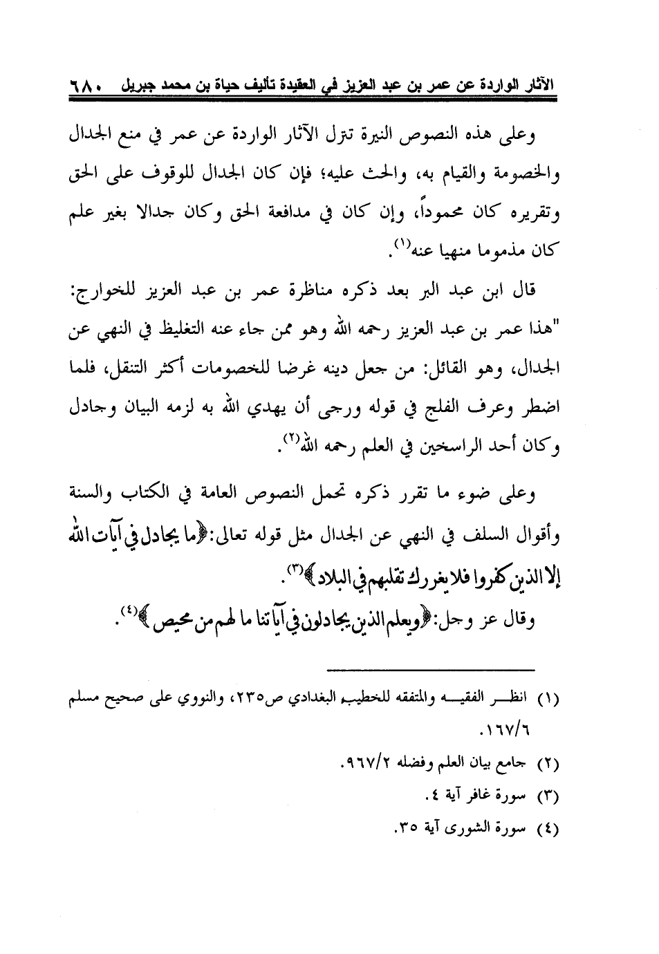 قال ابن عبد البر بعد ذكره مناظرة عمر بن عبد العزيز للخوارج: "هذا عمر بن عبد العزيز رحمه الله وهو ممن جاء عنه التغليظ في النهي عن الجدال، وهو القائل: من جعل دينه غرضا للخصومات أكثر التنقل، فلما اضطر وعرف الفلج في قوله ورجى أن يهدي الله به لزمه البيان وجادل وكان أحد الراسخين في العلم رحمه الله2.
