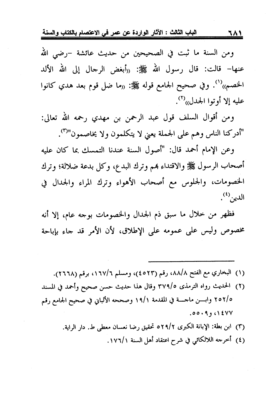 ومن السنة ما ثبت في الصحيحين من حديث عائشة - رضي الله عنها - قالت: قال رسول الله صلى الله عليه وسلم: "أبغض الرجال إلى الله الألد الخصم" 1. وفي صحيح الجامع قوله صلى الله عليه وسلم: "ما ضل قوم بعد هدي كانوا عليه إلا أوتوا الجدل"2.
