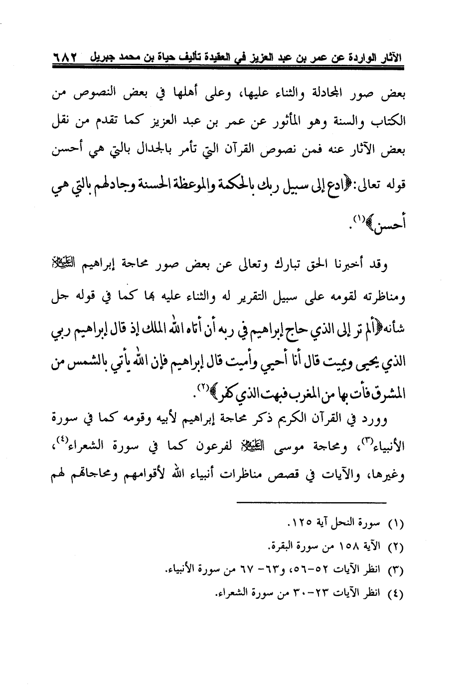 وقد أخبرنا الحق تبارك وتعالى عن بعض صور محاجة إبراهيم عليه السلام ومناظرته لقومه على سبيل التقرير له والثناء عليه بها كما في قوله جل شأنه: {أَلَمْ تَرَ إِلَى الَّذِي حَاجَّ إِبْرَاهِيمَ فِي رَبِّهِ أَنْ آتَاهُ اللَّهُ الْمُلْكَ إِذْ قَالَ إِبْرَاهِيمُ رَبِّيَ الَّذِي يُحْيِي وَيُمِيتُ قَالَ أَنَا أُحْيِي وَأُمِيتُ قَالَ إِبْرَاهِيمُ فَإِنَّ اللَّهَ يَأْتِي بِالشَّمْسِ مِنَ الْمَشْرِقِ فَأْتِ بِهَا مِنَ الْمَغْرِبِ فَبُهِتَ الَّذِي كَفَرَ} 2.