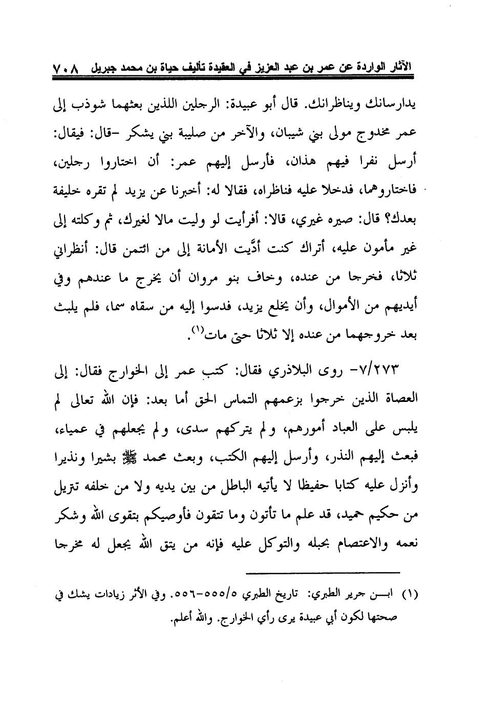 1 ابن جرير الطبري: تاريخ الطبري 5/555-556. وفي الأثر زيادات يشك في صحتها لكون أبي عبيدة يرى رأي الخوارج. والله أعلم.