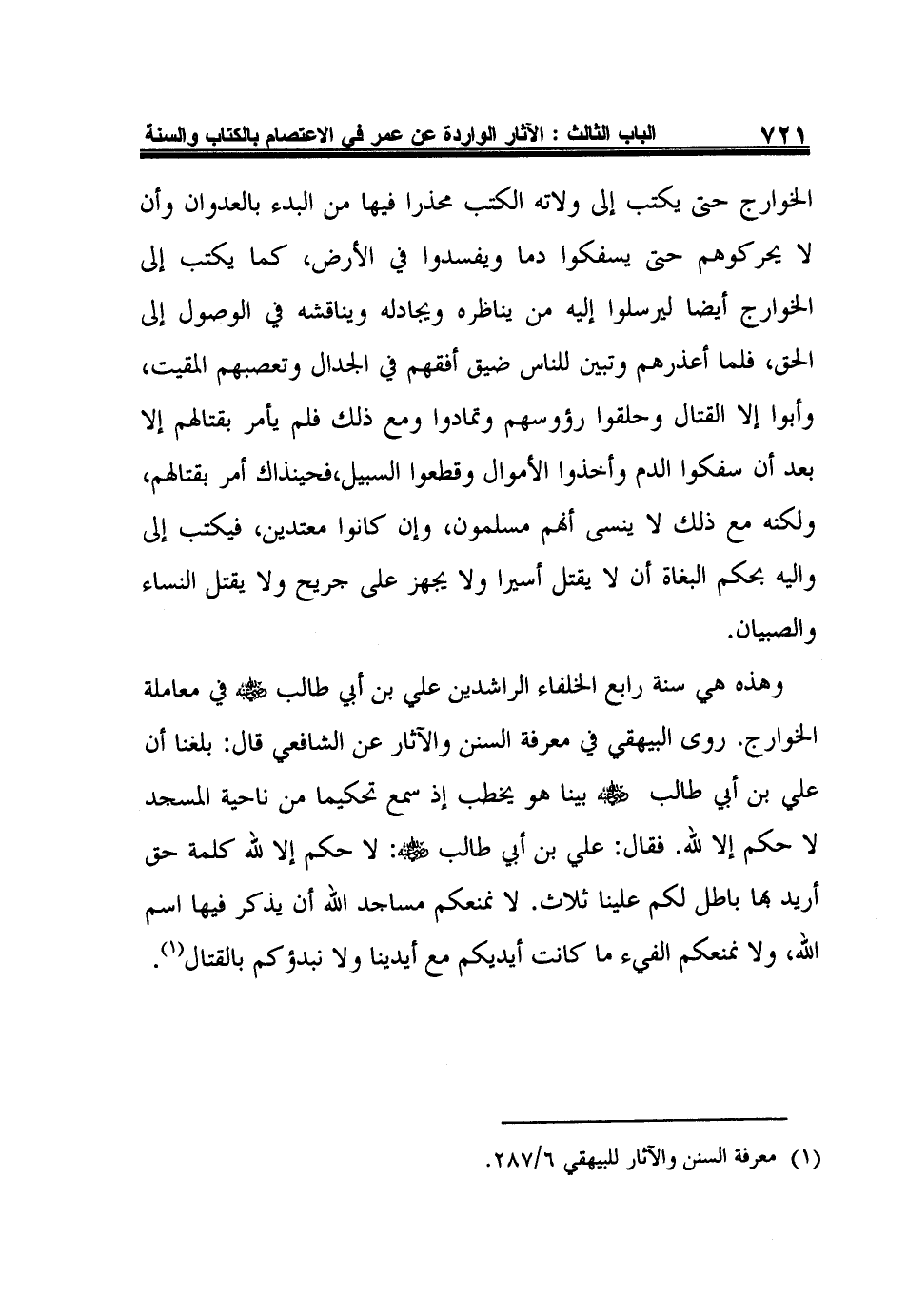 وهذه هي سنة رابع الخلفاء الراشدين علي بن أبي طالب رضي الله عنه في معاملة الخوارج. روى البيهقي في معرفة السنن والآثار عن الشافعي قال: بلغنا أن علي بن أبي طالب رضي الله عنه بينا هو يخطب إذ سمع تحكيما من ناحية المسجد لا حكم إلا لله. فقال: علي بن أبي طالب رضي الله عنه: لا حكم إلا لله كلمة حق أريد بها باطل لكم علينا ثلاث. لا نمنعكم مساجد الله أن يذكر فيها اسم الله، ولا نمنعكم الفيء ما كانت أيديكم مع أيدينا ولا نبدؤكم بالقتال1.