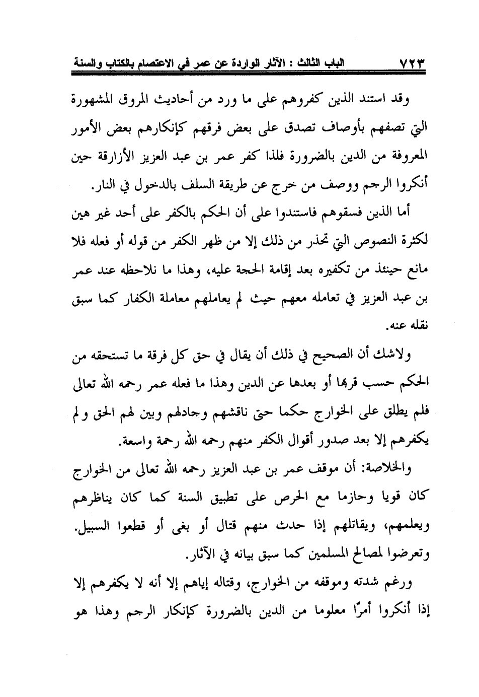 ولاشك أن الصحيح في ذلك أن يقال في حق كل فرقة ما تستحقه من الحكم حسب قربها أو بعدها عن الدين وهذا ما فعله عمر رحمه الله تعالى فلم يطلق على الخوارج حكما حتى ناقشهم وجادلهم وبين لهم الحق ولم يكفرهم إلا بعد صدور أقوال الكفر منهم رحمه الله رحمة واسعة.