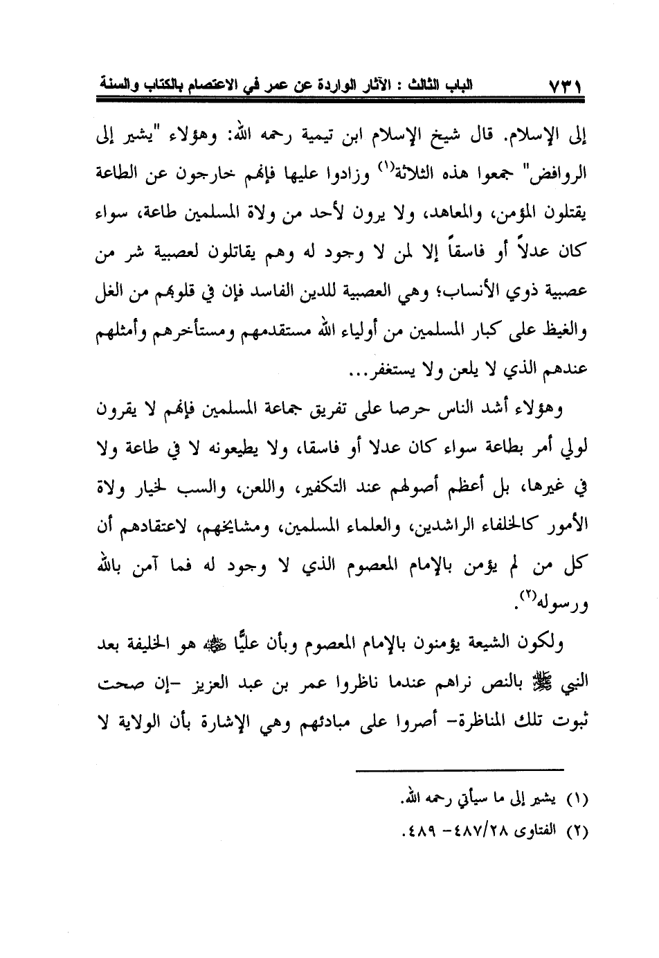 وهؤلاء أشد الناس حرصا على تفريق جماعة المسلمين فإنهم لا يقرون لولي أمر بطاعة سواء كان عدلا أو فاسقا، ولا يطيعونه لا في طاعة ولا في غيرها، بل أعظم أصولهم عند التكفير، واللعن، والسب لخيار ولاة الأمور كالخلفاء الراشدين، والعلماء المسلمين، ومشايخهم، لاعتقادهم أن كل من لم يؤمن بالإمام المعصوم الذي لا وجود له فما آمن بالله ورسوله2.