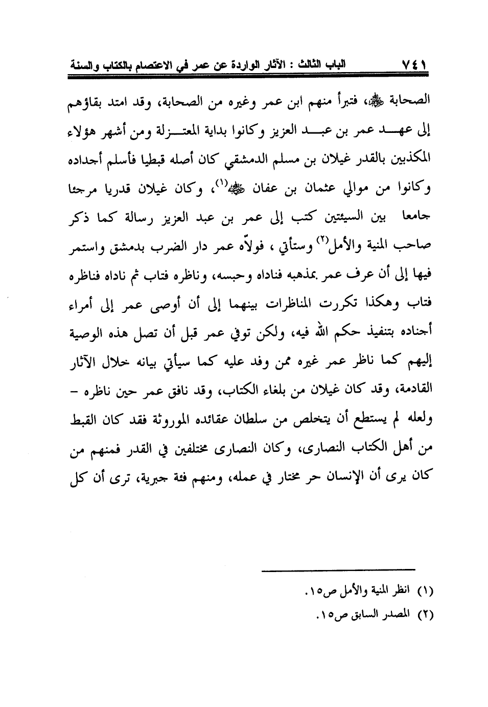 الصحابة رضي الله عنهم، فتبرأ منهم ابن عمر وغيره من الصحابة، وقد امتد بقاؤهم إلى عهد عمر بن عبد العزيز وكانوا بداية المعتزلة ومن أشهر هؤلاء المكذبين بالقدر غيلان بن مسلم الدمشقي كان أصله قبطيا فأسلم أجداده وكانوا من موالي عثمان بن عفان رضي الله عنه1، وكان غيلان قدريا مرجئا جامعا بين السيئتين كتب إلى عمر بن عبد العزيز رسالة كما ذكر صاحب المنية والأمل2 وستأتي، فولاّه عمر دار الضرب بدمشق واستمر فيها إلى أن عرف عمر بمذهبه فناداه وحبسه، وناظره فتاب ثم ناداه فناظره فتاب وهكذا تكررت المناظرات بينهما إلى أن أوصى عمر إلى أمراء أجناده بتنفيذ حكم الله فيه، ولكن توفي عمر قبل أن تصل هذه الوصية إليهم كما ناظر عمر غيره ممن وفد عليه كما سيأتي بيانه خلال الآثار القادمة، وقد كان غيلان من بلغاء الكتاب، وقد نافق عمر حين ناظره - ولعله لم يستطع أن يتخلص من سلطان عقائده الموروثة فقد كان القبط من أهل الكتاب النصارى، وكان النصارى مختلفين في القدر فمنهم من كان يرى أن الإنسان حر مختار في عمله، ومنهم فئة جبرية، ترى أن كل