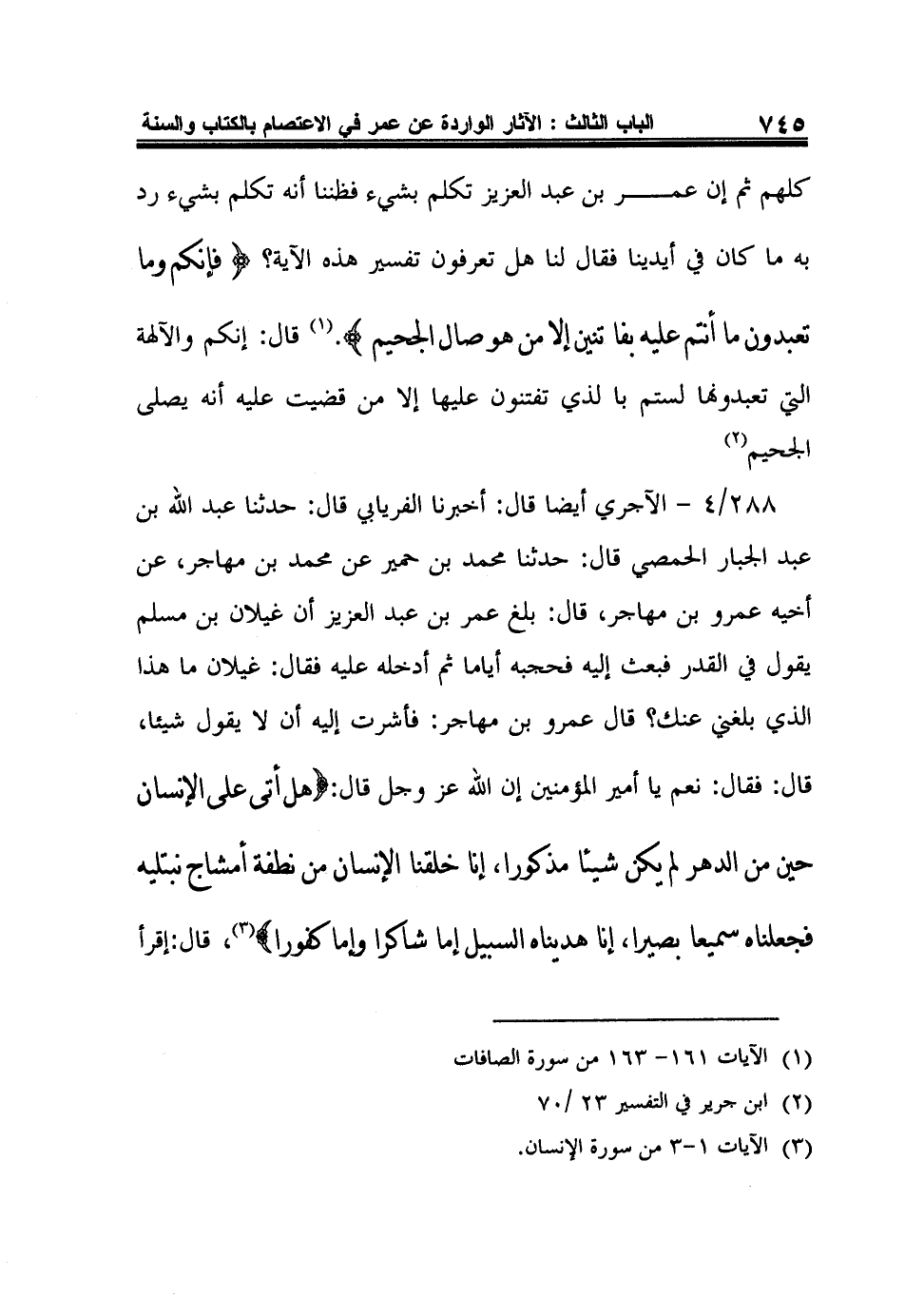 288/4 - الآجري أيضا قال: أخبرنا الفريابي قال: حدثنا عبد الله بن عبد الجبار الحمصي قال: حدثنا محمد بن حمير عن محمد بن مهاجر، عن أخيه عمرو بن مهاجر، قال: بلغ عمر بن عبد العزيز أن غيلان بن مسلم يقول في القدر فبعث إليه فحجبه أياما ثم أدخله عليه فقال: غيلان ما هذا الذي بلغني عنك؟ قال عمرو بن مهاجر: فأشرت إليه أن لا يقول شيئا، قال: فقال: نعم يا أمير المؤمنين إن الله عز وجل قال: {هَلْ أَتَى عَلَى الإِنْسَانِ حِينٌ مِنَ الدَّهْرِ لَمْ يَكُنْ شَيْئاً مَذْكُوراً إِنَّا خَلَقْنَا الإِنْسَانَ مِنْ نُطْفَةٍ أَمْشَاجٍ نَبْتَلِيهِ فَجَعَلْنَاهُ سَمِيعاً بَصِيراً إِنَّا هَدَيْنَاهُ السَّبِيلَ إِمَّا شَاكِراً وَإِمَّا كَفُوراً} 3، قال: إقرأ