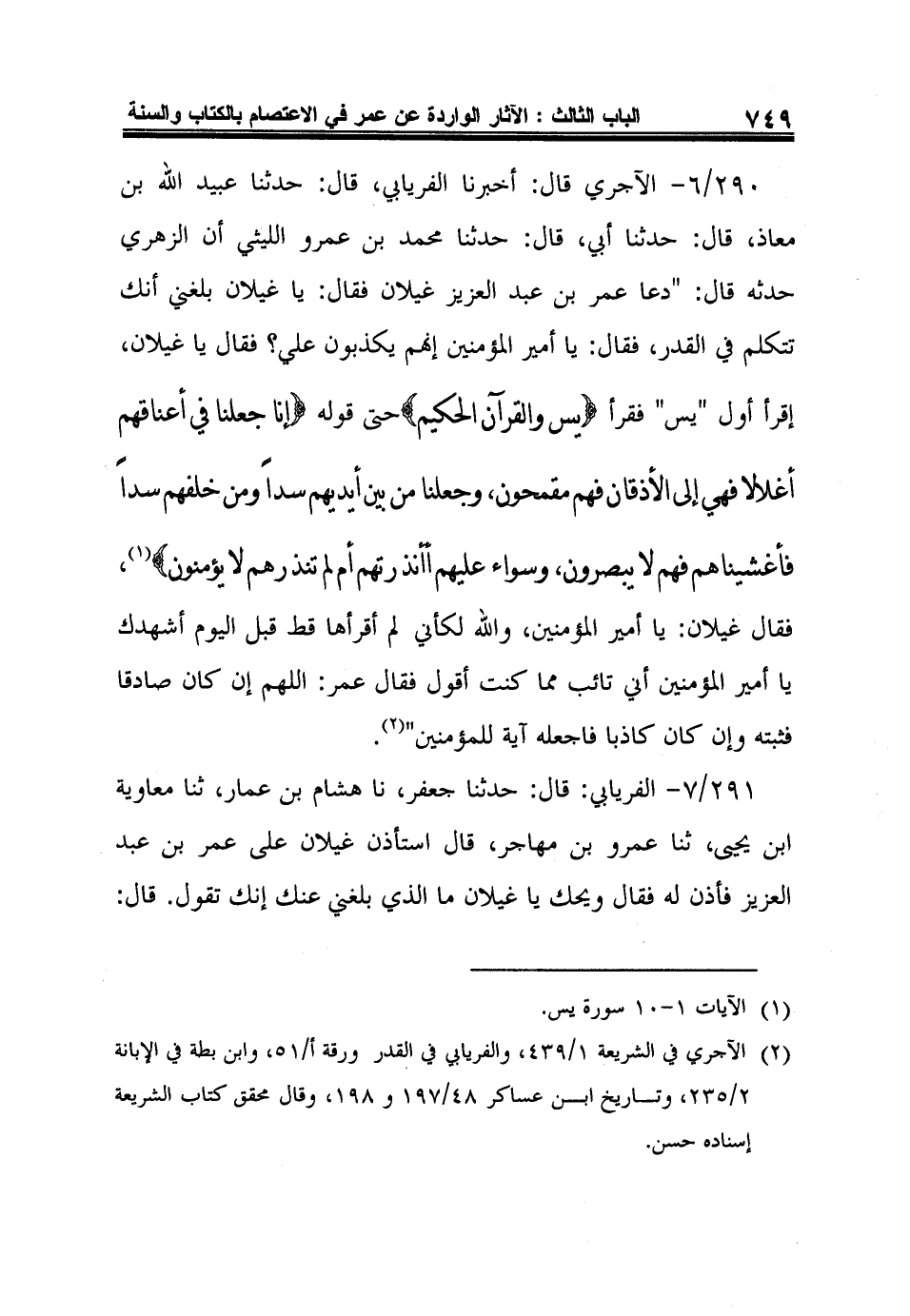 290/6- الآجري قال: أخبرنا الفريابي، قال: حدثنا عبيد الله بن معاذ، قال: حدثنا أبي، قال: حدثنا محمد بن عمرو الليثي أن الزهري حدثه قال: "دعا عمر بن عبد العزيز غيلان فقال: يا غيلان بلغني أنك تتكلم في القدر، فقال: يا أمير المؤمنين إنهم يكذبون علي؟ فقال يا غيلان، إقرأ أول "يس" فقرأ {يس وَالْقُرْآنِ الْحَكِيمِ} حتى قوله: {إِنَّا جَعَلْنَا فِي أَعْنَاقِهِمْ أَغْلالاً فَهِيَ إِلَى الأَذْقَانِ فَهُمْ مُقْمَحُونَ وَجَعَلْنَا مِنْ بَيْنِ أَيْدِيهِمْ سَدّاً وَمِنْ خَلْفِهِمْ سَدّاً فَأَغْشَيْنَاهُمْ فَهُمْ لا يُبْصِرُونَ وَسَوَاءٌ عَلَيْهِمْ أَأَنْذَرْتَهُمْ أَمْ لَمْ تُنْذِرْهُمْ لا يُؤْمِنُونَ} 1، فقال غيلان: يا أمير المؤمنين، والله لكأني لم أقرأها قط قبل اليوم أشهدك يا أمير المؤمنين أني تائب مما كنت أقول فقال عمر: اللهم إن كان صادقا فثبته وإن كان كاذبا فاجعله آية للمؤمنين"2.