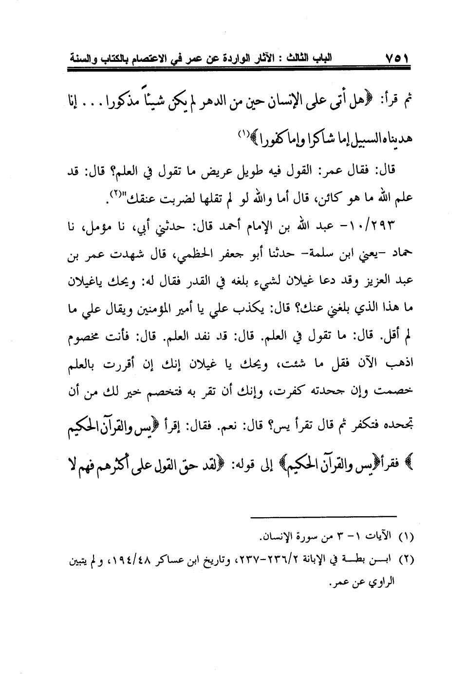 293/10- عبد الله بن الإمام أحمد قال: حدثني أبي، نا مؤمل، نا حماد - يعني ابن سلمة - حدثنا أبو جعفر الحظمي، قال شهدت عمر بن عبد العزيز وقد دعا غيلان لشيء بلغه في القدر فقال له: ويحك ياغيلان ما هذا الذي بلغني عنك؟ قال: يكذب علي يا أمير المؤمنين ويقال علي ما لم أقل. قال: ما تقول في العلم. قال: قد نفد العلم. قال: فأنت مخصوم اذهب الآن فقل ما شئت، ويحك يا غيلان إنك إن أقررت بالعلم خصمت وإن جحدته كفرت، وإنك أن تقر به فتخصم خير لك من أن تجحده فتكفر ثم قال تقرأ يس؟ قال: نعم. فقال: إقرأ {يس وَالْقُرْآنِ الْحَكِيمِ} فقرأ {يس وَالْقُرْآنِ الْحَكِيمِ} إلى قوله: {لَقَدْ حَقَّ الْقَوْلُ عَلَى أَكْثَرِهِمْ فَهُمْ لا