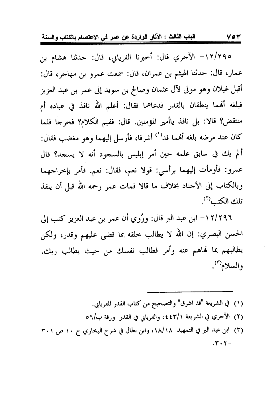 296/12- ابن عبد البر قال: ورُوي أن عمر بن عبد العزيز كتب إلى الحسن البصري: إن الله لا يطالب خلقه بما قضى عليهم وقدر، ولكن يطالبهم بما نهاهم عنه وأمر فطالب نفسك من حيث يطالب ربك. والسلام3.