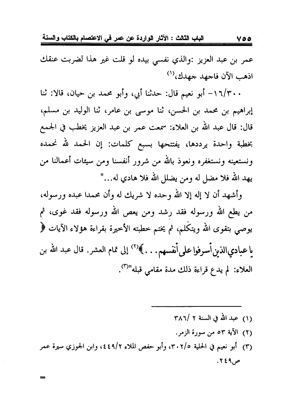 300/16- أبو نعيم قال: حدثنا أبي، وأبو محمد بن حيان، قالا: ثنا إبراهيم بن محمد بن الحسن، ثنا موسى بن عامر، ثنا الوليد بن مسلم، قال: قال عبد الله بن العلاء: سمعت عمر بن عبد العزيز يخطب في الجمع بخطبة واحدة يرددها، يفتتحها بسبع كلمات: إن الحمد لله نحمده ونستعينه ونستغفره ونعوذ بالله من شرور أنفسنا ومن سيئات أعمالنا من يهد الله فلا مضل له ومن يضلل الله فلا هادي له ... ".