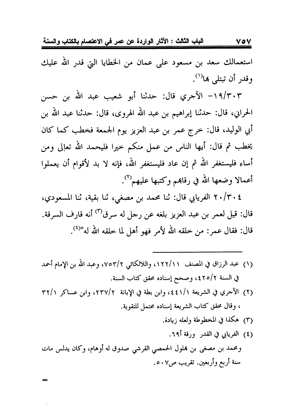 304/20 الفريابي قال: ثنا محمد بن مصغي، ثنا بقية، ثنا المسعودي، قال: قيل لعمر بن عبد العزيز بلغه عن رجل له سرق3 أنه قارف السرقة. قال: فقال عمر: من خلقه الله لأمر فهو أهل لما خلقه الله له"4.