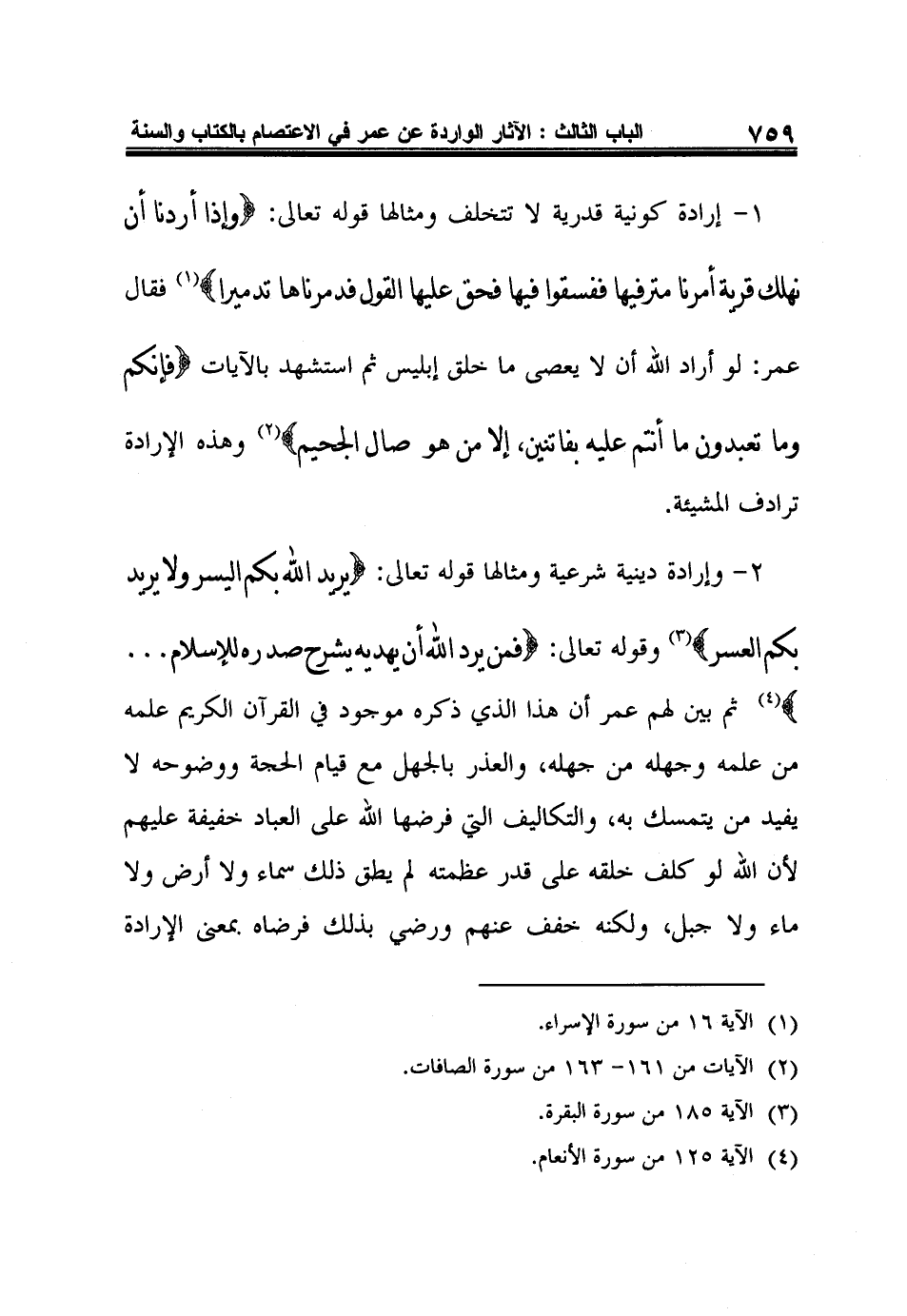 2- وإرادة دينية شرعية ومثالها قوله تعالى: {يُرِيدُ اللَّهُ بِكُمُ الْيُسْرَ وَلا يُرِيدُ بِكُمُ الْعُسْرَ} 3 وقوله تعالى: {فَمَنْ يُرِدِ اللَّهُ أَنْ يَهْدِيَهُ يَشْرَحْ صَدْرَهُ لِلإِسْلامِ ... } 4 ثم بين لهم عمر أن هذا الذي ذكره موجود في القرآن الكريم علمه من علمه وجهله من جهله، والعذر بالجهل مع قيام الحجة ووضوحه لا يفيد من يتمسك به، والتكاليف التي فرضها الله على العباد خفيفة عليهم لأن الله لو كلف خلقه على قدر عظمته لم يطق ذلك سماء ولا أرض ولا ماء ولا جبل، ولكنه خفف عنهم ورضي بذلك فرضاه بمعنى الإرادة