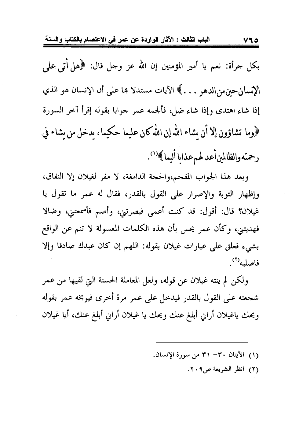 بكل جرأة: نعم يا أمير المؤمنين إن الله عز وجل قال: {هَلْ أَتَى عَلَى الإِنْسَانِ حِينٌ مِنَ الدَّهْرِ ... } الآيات مستدلا بها على أن الإنسان هو الذي إذا شاء اهتدى وإذا شاء ضل، فألجمه عمر جوابا بقوله إقرأ آخر السورة {وَمَا تَشَاءُونَ إِلاَّ أَنْ يَشَاءَ اللَّهُ إِنَّ اللَّهَ كَانَ عَلِيماً حَكِيماً يُدْخِلُ مَنْ يَشَاءُ فِي رَحْمَتِهِ وَالظَّالِمِينَ أَعَدَّ لَهُمْ عَذَاباً أَلِيماً} 1.