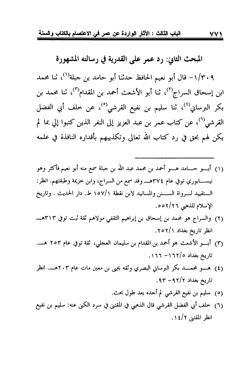 309/1- قال أبو نعيم الحافظ حدثنا أبو حامد بن جبلة1، ثنا محمد ابن إسحاق السراج2، ثنا أبو الأشعث أحمد بن المقدام3، ثنا محمد بن بكر البرساني4، ثنا سليم بن نفيع القرشي5، عن خلف أبي الفضل القرشي6، عن كتاب عمر بن عبد العزيز إلى النفر الذين كتبوا إلي بما لم يكن لهم بحق في رد كتاب الله تعالى وتكذيبهم بأقداره النافذة في علمه
