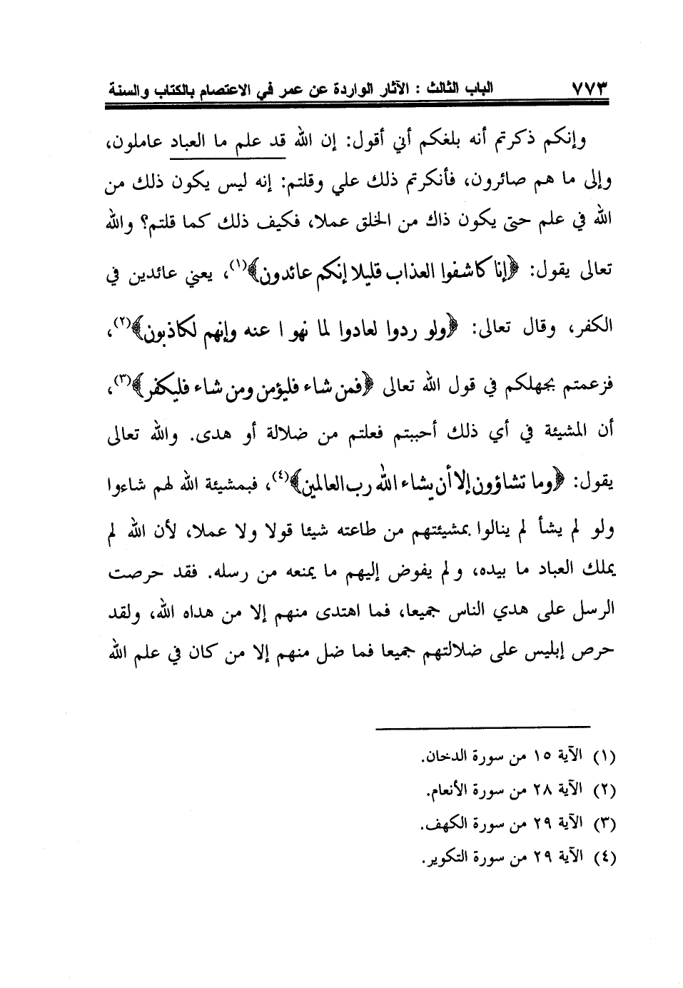 وإنكم ذكرتم أنه بلغكم أني أقول: إن الله قد علم ما العباد عاملون، وإلى ما هم صائرون، فأنكرتم ذلك علي وقلتم: إنه ليس يكون ذلك من الله في علم حتى يكون ذاك من الخلق عملا، فكيف ذلك كما قلتم؟ والله تعالى يقول: {إِنَّا كَاشِفُو الْعَذَابِ قَلِيلاً إِنَّكُمْ عَائِدُونَ} 1، يعني عائدين في الكفر، وقال تعالى: {وَلَوْ رُدُّوا لَعَادُوا لِمَا نُهُوا عَنْهُ وَإِنَّهُمْ لَكَاذِبُونَ} 2، فزعمتم بجهلكم في قول الله تعالى {فَمَنْ شَاءَ فَلْيُؤْمِنْ وَمَنْ شَاءَ فَلْيَكْفُرْ} 3، أن المشيئة في أي ذلك أحببتم فعلتم من ضلالة أو هدى. والله تعالى يقول: {وَمَا تَشَاءُونَ إِلاَّ أَنْ يَشَاءَ اللَّهُ رَبُّ الْعَالَمِينَ} 4، فبمشيئة الله لهم شاءوا ولو لم يشأ لم ينالوا بمشيئتهم من طاعته شيئا قولا ولا عملا، لأن الله لم يملك العباد ما بيده، ولم يفوض إليهم ما يمنعه من رسله. فقد حرصت الرسل على هدي الناس جميعا، فما اهتدى منهم إلا من هداه الله، ولقد حرص إبليس على ضلالتهم جميعا فما ضل منهم إلا من كان في علم الله