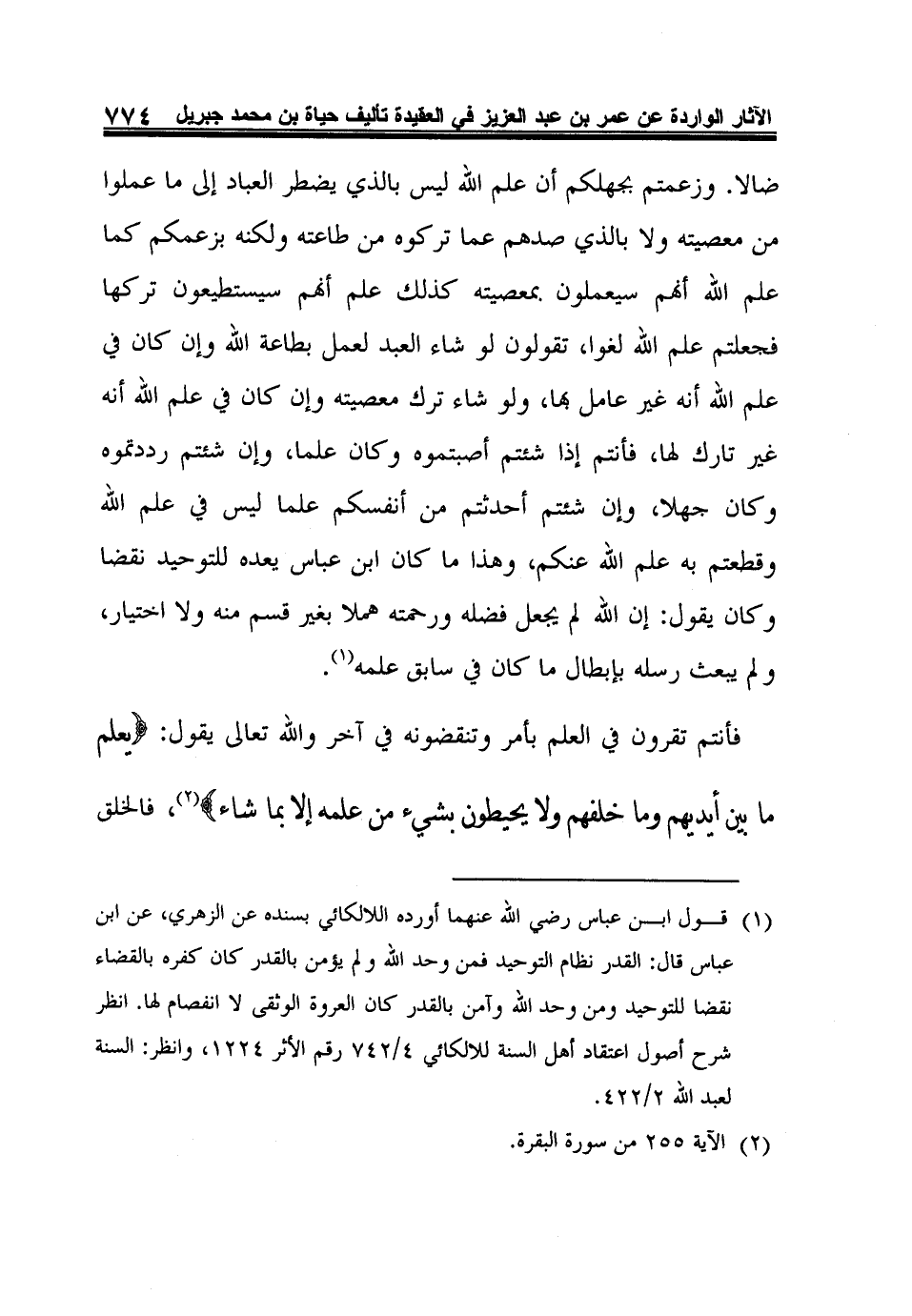1 قول ابن عباس رضي الله عنهما أورده اللالكائي بسنده عن الزهري، عن ابن عباس قال: القدر نظام التوحيد فمن وحد الله ولم يؤمن بالقدر كان كفره بالقضاء نقضا للتوحيد ومن وحد الله وآمن بالقدر كان العروة الوثقى لا انفصام لها. انظر شرح أصول اعتقاد أهل السنة للالكائي 4/742 رقم الأثر 1224، وانظر: السنة لعبد الله 2/422.