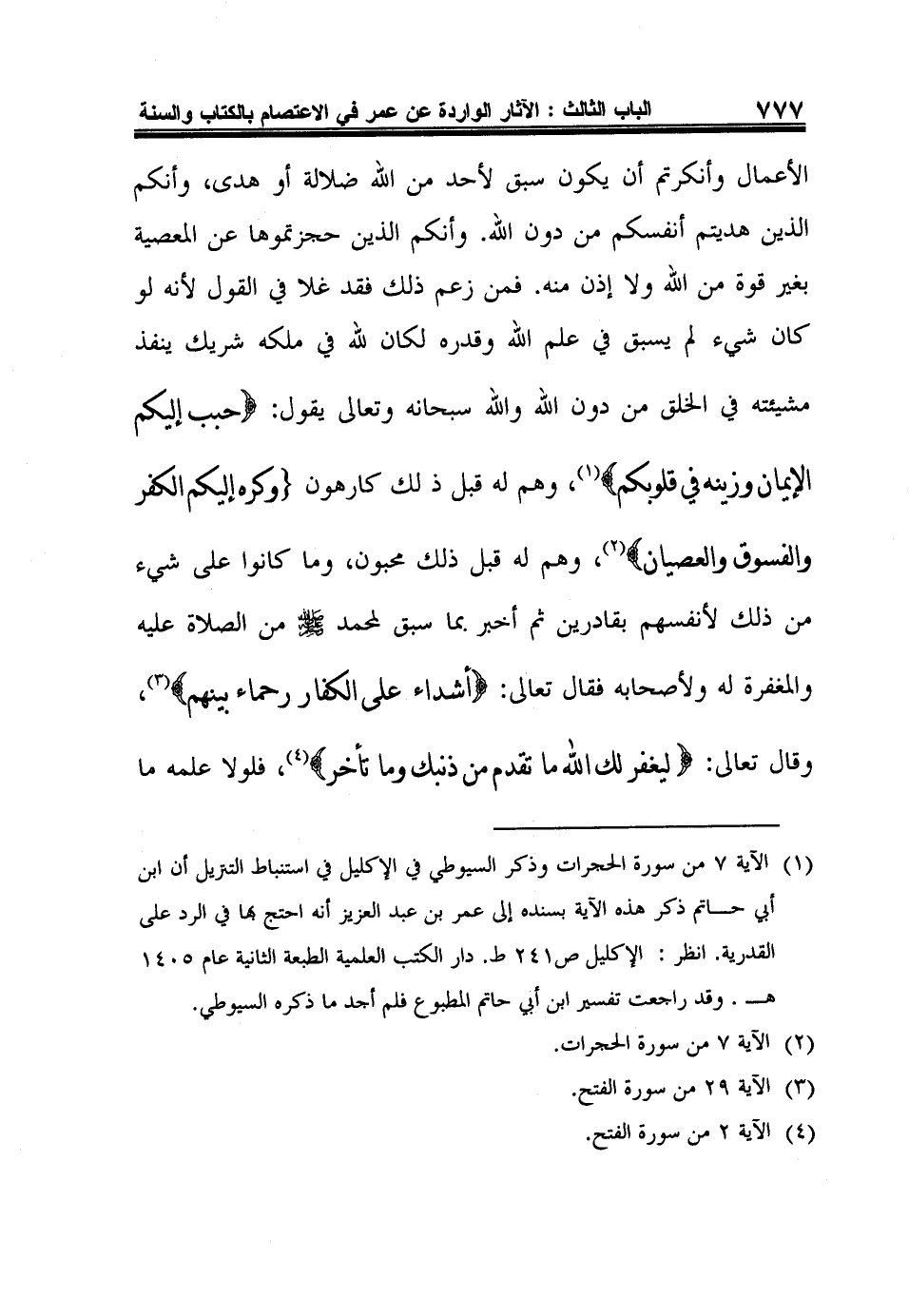 1 الآية 7 من سورة الحجرات وذكر السيوطي في الإكليل في استنباط التنزيل أن ابن أبي حاتم ذكر هذه الآية بسنده إلى عمر بن عبد العزيز أنه احتج بها في الرد على القدرية. انظر: الإكليل ص241 ط. دار الكتب العلمية الطبعة الثانية عام 1405هـ. وقد راجعت تفسير ابن أبي حاتم المطبوع فلم أجد ما ذكره السيوطي.