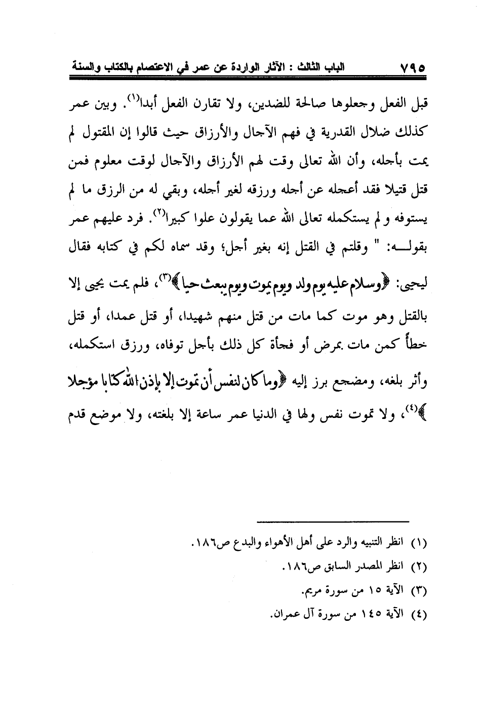 قبل الفعل وجعلوها صالحة للضدين، ولا تقارن الفعل أبدا1. وبين عمر كذلك ضلال القدرية في فهم الآجال والأرزاق حيث قالوا إن المقتول لم يمت بأجله، وأن الله تعالى وقت لهم الأرزاق والآجال لوقت معلوم فمن قتل قتيلا فقد أعجله عن أجله ورزقه لغير أجله، وبقي له من الرزق ما لم يستوفه ولم يستكمله تعالى الله عما يقولون علوا كبيرا2. فرد عليهم عمر بقوله: " وقلتم في القتل إنه بغير أجل، وقد سماه لكم في كتابه فقال ليحيى: {وَسَلامٌ عَلَيْهِ يَوْمَ وُلِدَ وَيَوْمَ يَمُوتُ وَيَوْمَ يُبْعَثُ حَيّاً} 3، فلم يمت يحيى إلا بالقتل وهو موت كما مات من قتل منهم شهيدا، أو قتل عمدا، أو قتل خطأً كمن مات بمرض أو فجأة كل ذلك بأجل توفاه، ورزق استكمله، وأثر بلغه، ومضجع برز إليه {وَمَا كَانَ لِنَفْسٍ أَنْ تَمُوتَ إِلاَّ بِإِذْنِ اللَّهِ كِتَاباً مُؤَجَّلاً} 4، ولا تموت نفس ولها في الدنيا عمر ساعة إلا بلغته، ولا موضع قدم