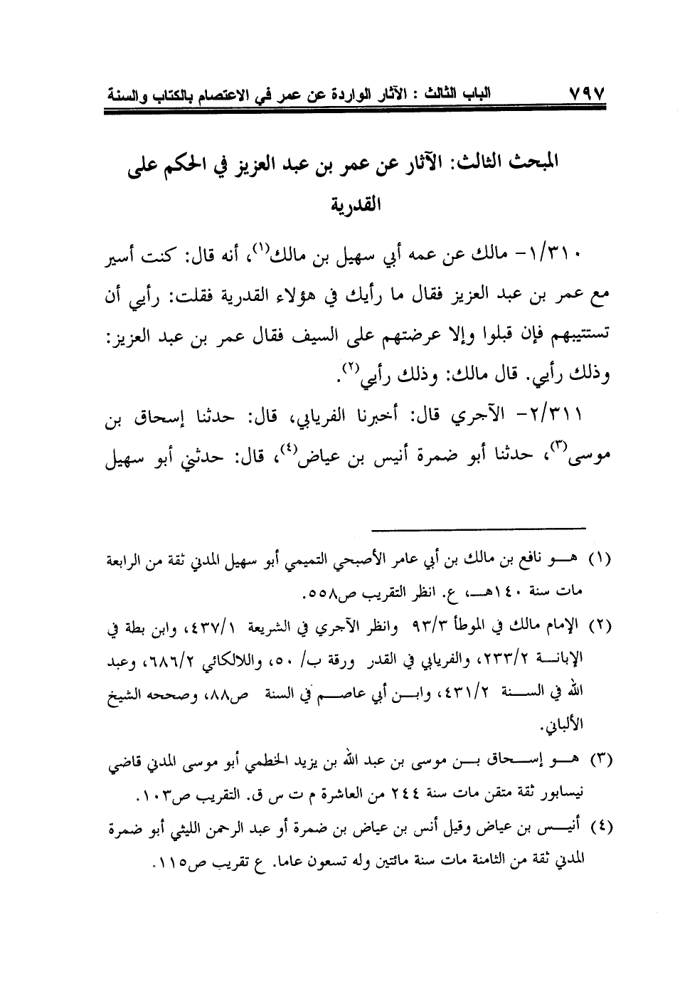 310/1- مالك عن عمه أبي سهيل بن مالك1، أنه قال: كنت أسير مع عمر بن عبد العزيز فقال ما رأيك في هؤلاء القدرية فقلت: رأيي أن تستتيبهم فإن قبلوا وإلا عرضتهم على السيف فقال عمر بن عبد العزيز: وذلك رأيي. قال مالك: وذلك رأيي2.