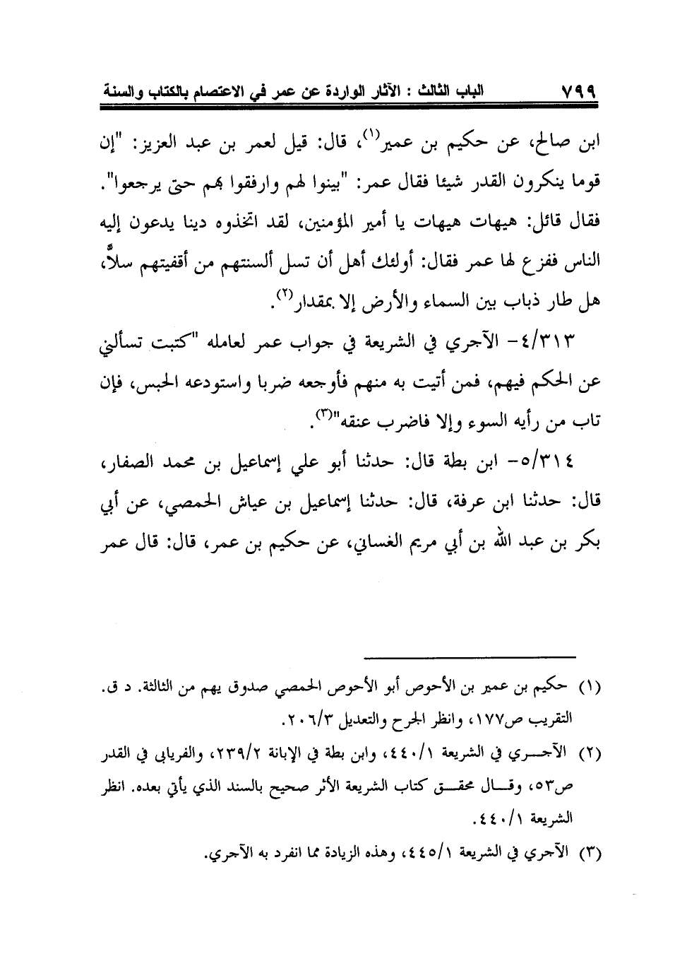 313/4- الآجري في الشريعة في جواب عمر لعامله: "كتبت تسألني عن الحكم فيهم، فمن أتيت به منهم فأوجعه ضربا واستودعه الحبس، فإن تاب من رأيه السوء وإلا فاضرب عنقه"3.