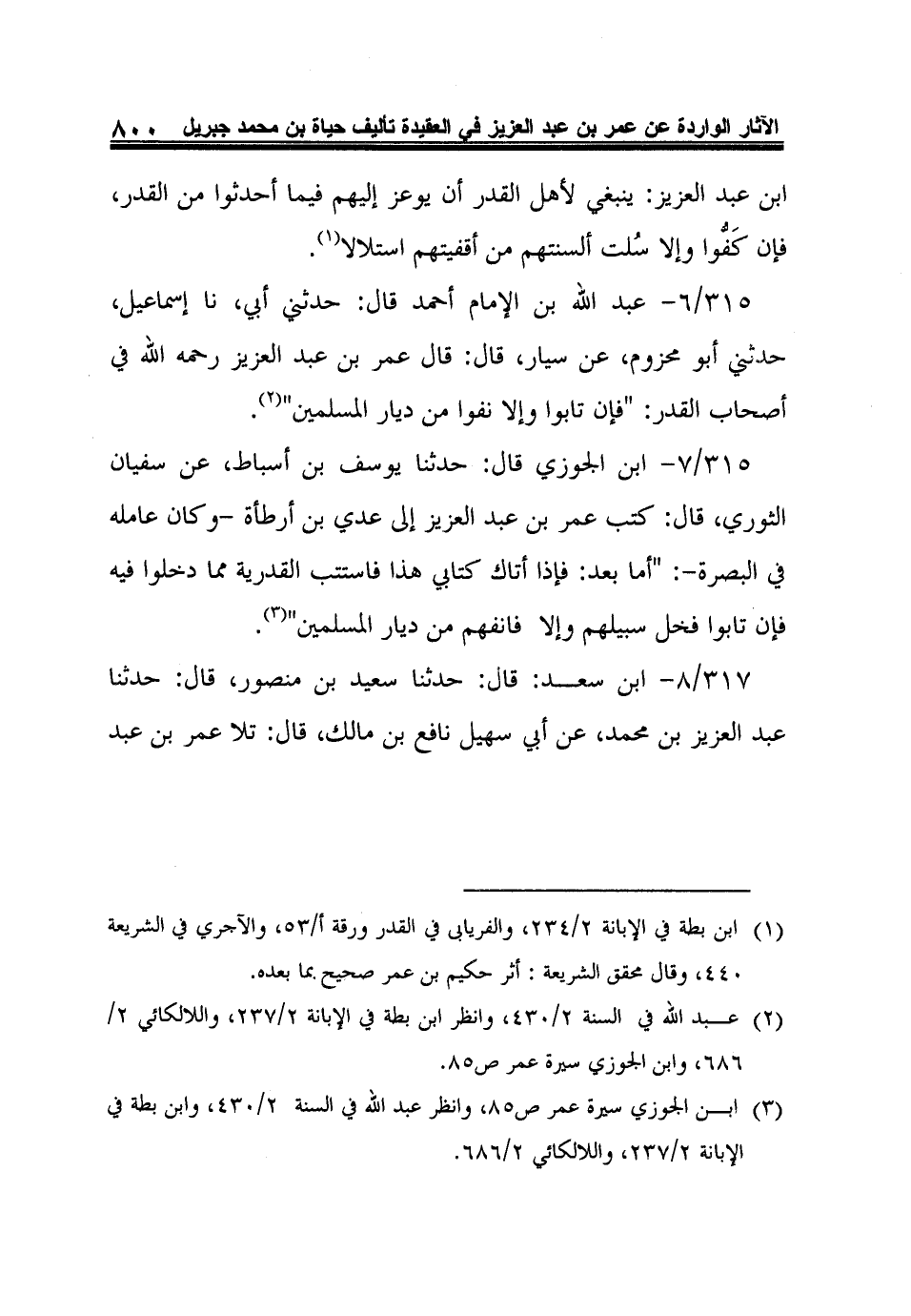 3 ابن الجوزي سيرة عمر ص85، وانظر عبد الله في السنة 2/430، وابن بطة في الإبانة 2/237، واللالكائي 2/686.