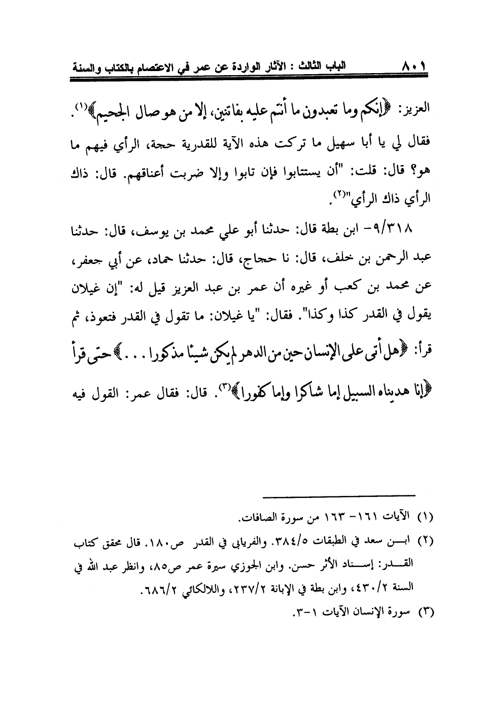 318/9- ابن بطة قال: حدثنا أبو علي محمد بن يوسف، قال: حدثنا عبد الرحمن بن خلف، قال: نا حجاج، قال: حدثنا حماد، عن أبي جعفر، عن محمد بن كعب أو غيره أن عمر بن عبد العزيز قيل له: "إن غيلان يقول في القدر كذا وكذا". فقال: "يا غيلان: ما تقول في القدر فتعوذ، ثم قرأ: {هَلْ أَتَى عَلَى الإِنْسَانِ حِينٌ مِنَ الدَّهْرِ لَمْ يَكُنْ شَيْئاً مَذْكُوراً ... } حتى قرأ {إِنَّا هَدَيْنَاهُ السَّبِيلَ إِمَّا شَاكِراً وَإِمَّا كَفُوراً} 3. قال: فقال عمر: القول فيه