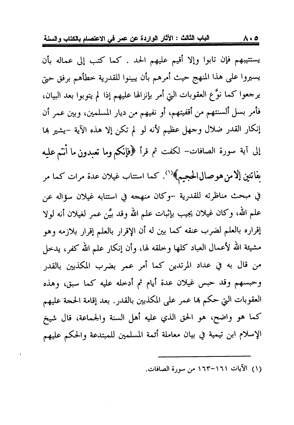 يستتيبهم فإن تابوا وإلا أقيم عليهم الحد. كما كتب إلى عماله بأن يسيروا على هذا المنهج حيث أمرهم بأن يبينوا للقدرية خطأهم برفق حتى يرجعوا كما نوَّع العقوبات التي أمر بإنزالها عليهم إذا لم يتوبوا بعد البيان، فأمر بسل ألسنتهم من أقفيتهم، أو نفيهم من ديار المسلمين، وبين عمر أن إنكار القدر ضلال وجهل عظيم لأنه لو لم تكن إلا هذه الآية -يشير بها إلى آية سورة الصافات- لكفت ثم قرأ {فَإِنَّكُمْ وَمَا تَعْبُدُونَ مَا أَنْتُمْ عَلَيْهِ بِفَاتِنِين إِلاَّ مَنْ هُوَ صَالِ الْجَحِيمِ} 1. كما استتاب غيلان عدة مرات كما مر في مبحث مناظرته للقدرية -وكان منهجه في استتابه غيلان سؤاله عن علم الله، وكان غيلان يجيب بإثبات علم الله وقد بيَّن عمر لغيلان أنه لولا إقراره بالعلم لضرب عنقه كما بين له أن الإقرار بالعلم إقرار بلازمه وهو مشيئة الله لأعمال العباد كلها وخلقه لها، وأن إنكار علم الله كفر، يدخل من قال به في عداد المرتدين كما أمر عمر بضرب المكذبين بالقدر وحبسهم وقد حبس غيلان عدة أيام ثم أدخله عليه كما سبق، وهذه العقوبات التي حكم بها عمر على المكذبين بالقدر. بعد إقامة الحجة عليهم كما هو واضح، هو الحق الذي عليه أهل السنة والجماعة، قال شيخ الإسلام ابن تيمية في بيان معاملة أئمة المسلمين للمبتدعة والحكم عليهم